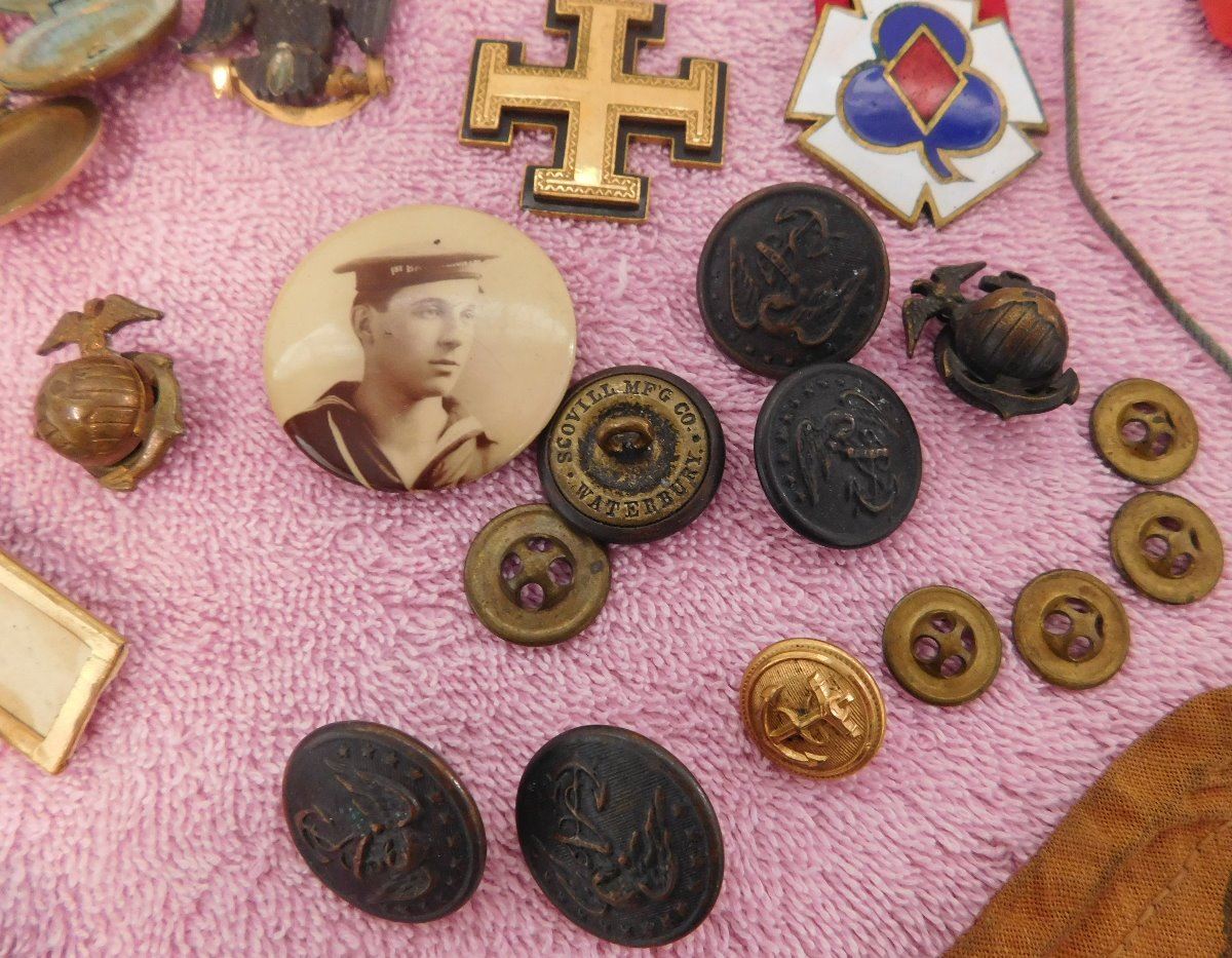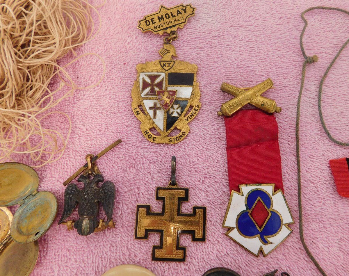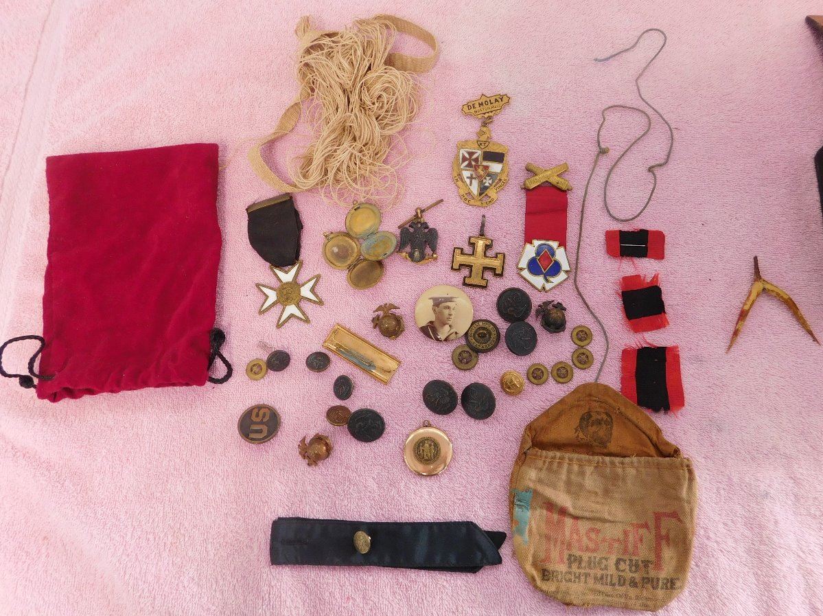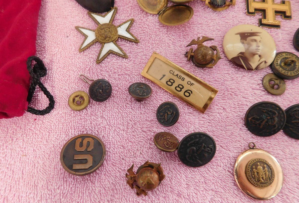 Collection of Civil War Medals & Buttons in Box, circa 1860s-1880s. Made of ribbon, brass, iron and paint, the box itself measures 6.5" x 5.5" x 3". Some medals are from Boston. Condition: As found, see images. Shipping: $22.00 w/insurance and signature.