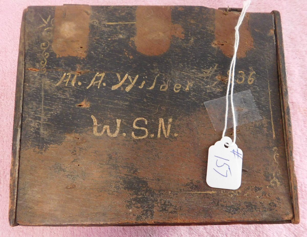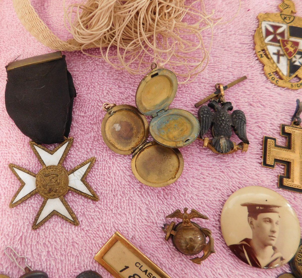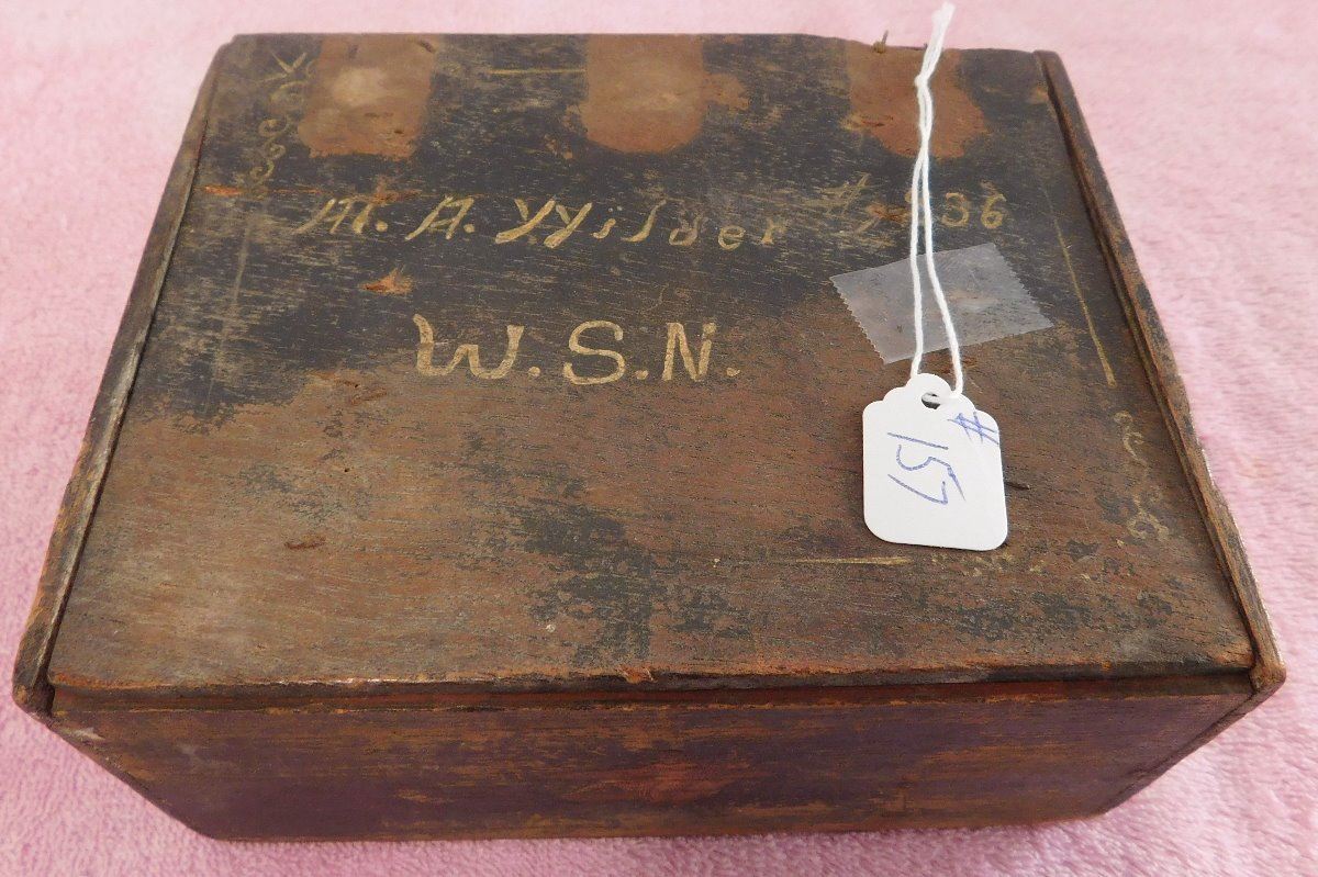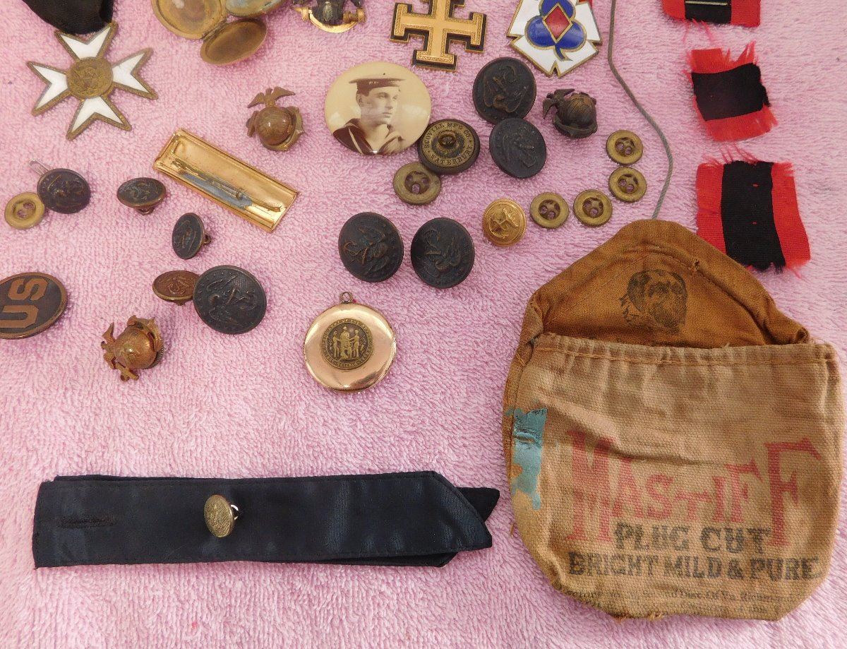 Collection of Civil War Medals & Buttons in Box, circa 1860s-1880s. Made of ribbon, brass, iron and paint, the box itself measures 6.5" x 5.5" x 3". Some medals are from Boston. Condition: As found, see images. Shipping: $22.00 w/insurance and signature.