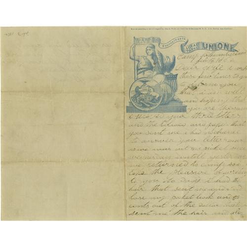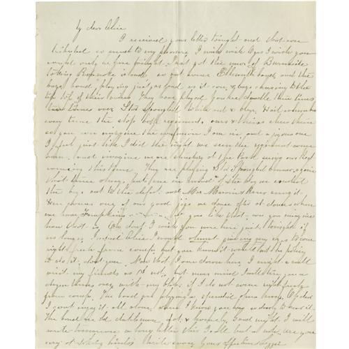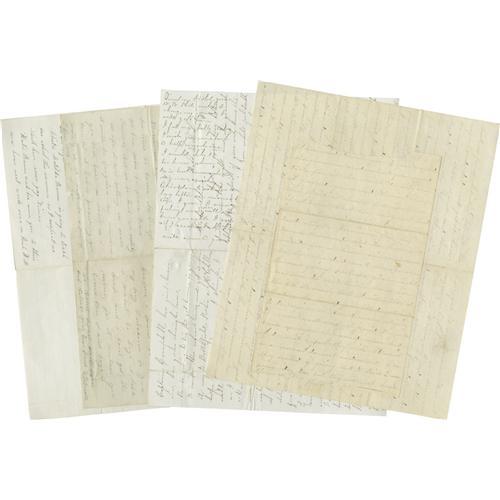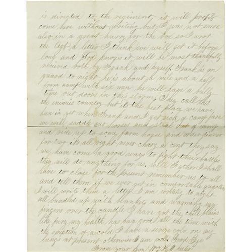 <B>Collection of Civil War Soldiers' Letters</B></I> Comprises 32 ALsS, varying in length from 1p to 4p, 5" x 8" to 8" x 12", 1861-1864. A few letters are incomplete, five are on patriotic letterheads; ten original envelopes. The soldiers mainly talk about family matters, everyday life, personal feelings, and military activities. Quotes from some of the letters, spelling uncorrected: <I>"Look at Comodore Burnside's expedition 20 vessels in the bottom of the Atlantic ocean all owing to incompetance"; "You wanted to know where I went to that night I was taken prisoner...I never knew before how a fellow feels after he surrenders but I felt ashamed enough. They took us to Gen Winder's Head Quarters and he tried to pump me concerning our forces Where Pope was and where Seigel was and many other things all I told him was he would find them soon enough...the General said he thought I was a slippery character and he had better hand cuff & shackle me for fear I would escape but I lied to him like a preacher and he finely let me lay down on the grass"; "Got our new gons last Week and tha are A Splendid Gon tha ar the US trean Rifel i think i could knock A secesh three or Four hundred yards easy"; "i dont think this war will close within three years as long as the north will take the stand she dare there will never be peace but if the north would bee all of the same mind it would not last long but the South knows that the north is divided and it incarages them and discarages our soldiers"; "General George B. McClelland sente in an order yesterday. Afternoon At 3 oclock to the rebbels to surrender. they refused to do so."; "there is lots of our fellow up at White Oak Swamp laying around that never was nor Ever will be Burried nothing Will mark thier spot but bleaching Bones allready the Silent vultures darken around thier prey We are often slow to think poor fellow you have about 4 feet of your Bounty land, and an honorable discharge then Pour Scotts requiem o'er the dead, Soldier rest thy warfares o'er Sleep the Sleep that knows not Braking Dream of battle fields no more days of danger nights of waking & so forth"; "We will go do all that god and our good arms will aid us on to do, we are all Tobacoless penniless Stampless & Less Everything but I dont want any thing I feel Just as content with nothing as I use to with plenty"; "I have Taned up till i am all most as black as a nehro I am almost a fraid be out a lone for fear that some one will clame me for a contriband"; "To day I was put in charge Camp Convalescent at this hospital and have four Surgeons under me this is considered quite a promotion. There is only one Surgeon higher than me and there are from 20 to 24 of us in all".</B></I> Also includes five letters of ladies to various correspondents, mostly soldiers. Condition varies with some soiling and browning, but the letters are mostly in fine condition. In all, 47 items.