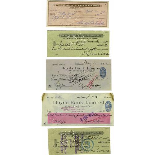<B>Collection of Clifton Webb Checks</B></I> Offered here are five checks signed by Webb. Four were written and signed by him as payer and one endorsed as payee. Two are from Lloyds Bank Limited in London and are dated 1922 and two are from Manufacturers Trust Company in New York, dated 1925. The fifth is made out to Webb and is dated 1947. It would be interesting to research these. <I>With COA from PSA/DNA.</B></I>