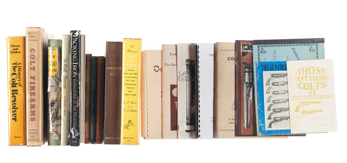 Approximately 18 books related to Colt firearms such as "A History of the Colt Revolver" (2 copies), "Colt Firearms from 1836", "Colt Tips", "51 Colt Navies", "The Story of Colt's Revolver", "Armsmear: The Home, the Arm, and the Armory of Samuel Colt", "Colt Peacemaker Dictionary & Encyclopedia", "Home Gunsmith the Colt Single Action Revolvers", "Colt's Variations of the Old Model Pocket Pistol", "Packing Iron".