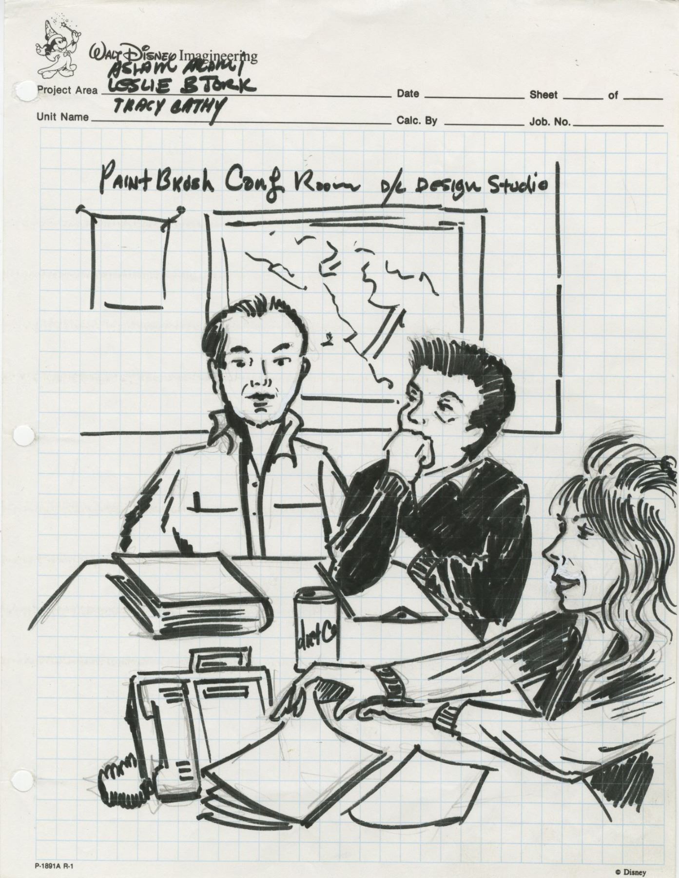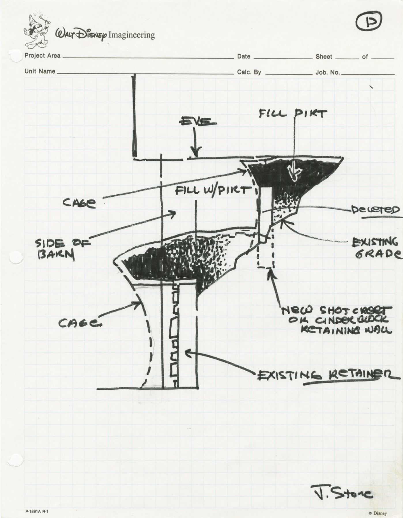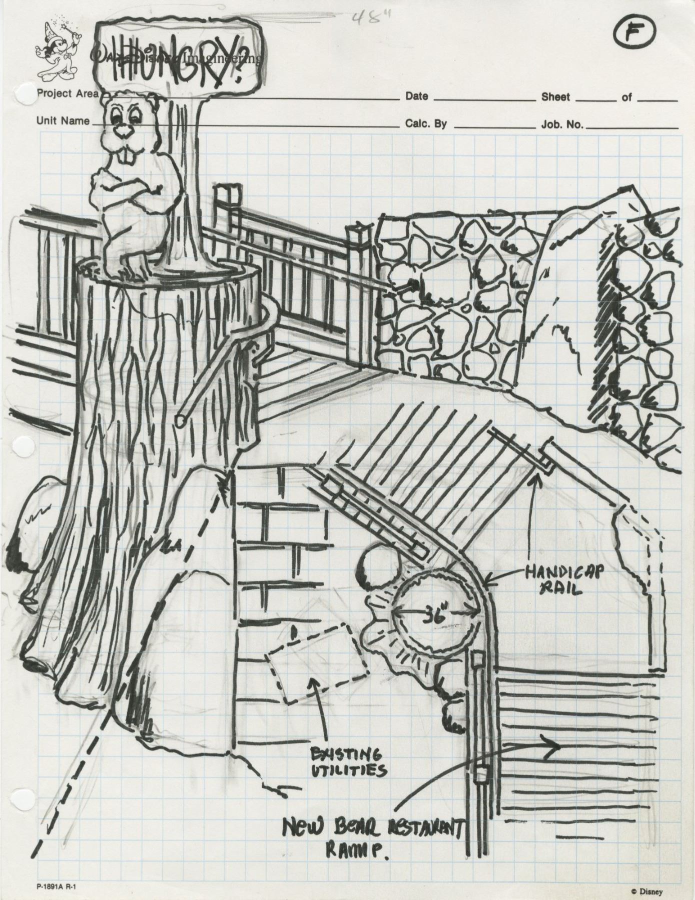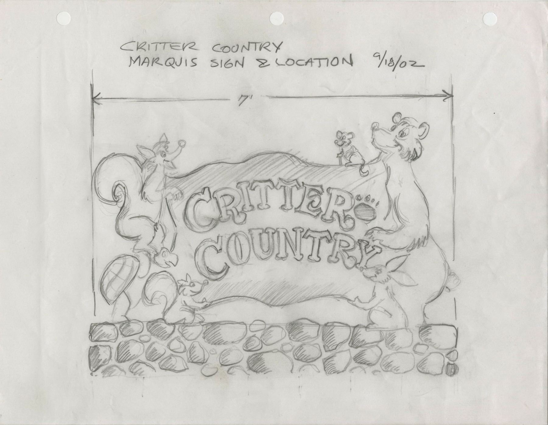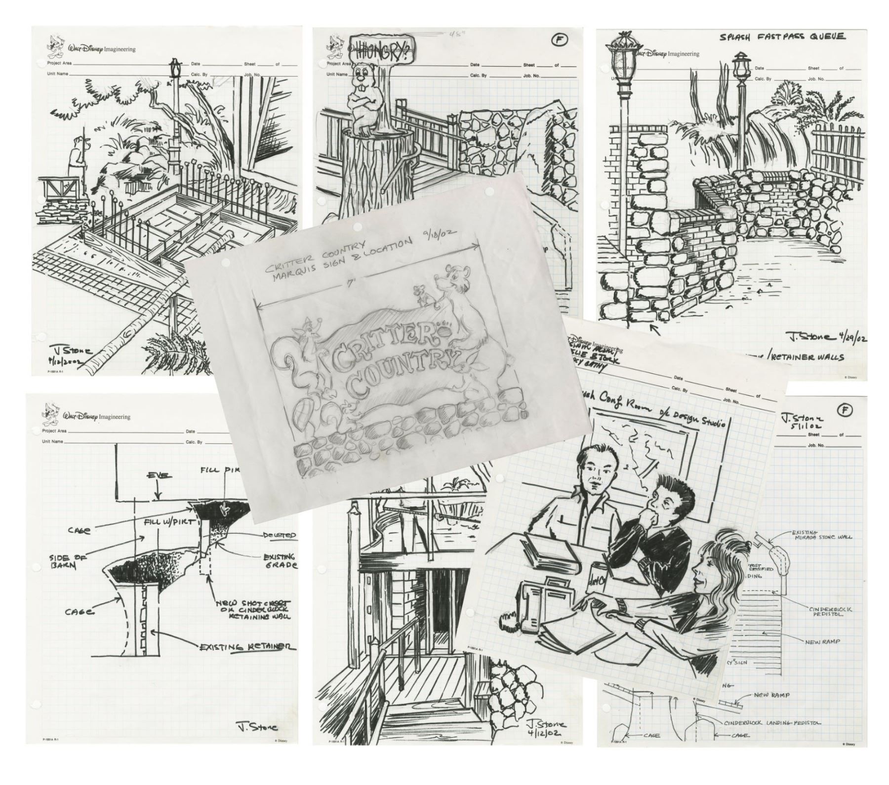 (Disneyland, c.2002) A collection of over 40 original drawings created by Imagineer John Stone for a variety of Disneyland's attractions and structures. These drawings were used by Stone while designing signage for "Critter Country", details of the FastPass area for "Splash Mountain", aspects of "The Many Adventures of Winnie the Pooh", the "Hungry Bear" restaurant, and more. These drawings are accomplished in ink and pencil, some on blank paper and others on Imagineering stationary. Many of the sheets feature Stone's notes, signatures, dates, and other descriptions. Some of these drawings feature incredible scenic views of aspects of the park, while other drawings focus on specific details. These sheets vary in size but the majority measure 8.5"x11". The set is in very good condition with minor wear from use.
