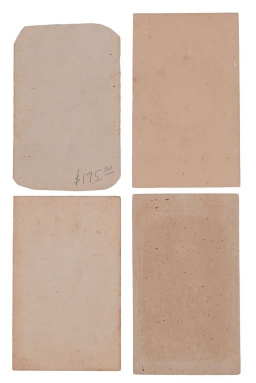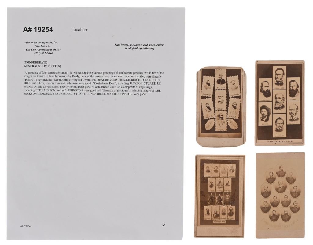 A grouping of four composite cartes-de-viste depicting various Confederate Generals. While two of the images are known to have been made by Brady, none of the images have backmarks, indicating they were illegaly "pirated". They include "Rebel Army of Virginia", with Generals Lee, Beauregard, Breckinridge, Longstreet, hill, and others, corners trimmed otherwise very good. "Confederate Dead", including Jackson, Stuart, J.H. Morgan, and eleven others. Heavily foxed otherwise good condition. "Confederate Generals", a composite of engravings, including Lee, Jackson, and A.S. Johnston, very good condition. "Generals of the South" including images of Lee, Jackson, Morgan, Beauregard, Stuart, Longstreet, and Joe Johnston. Very good condition.