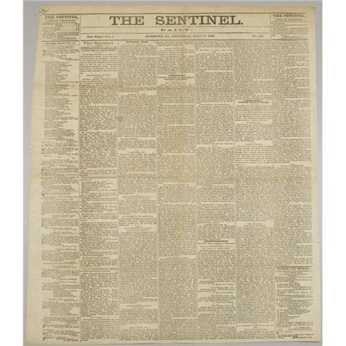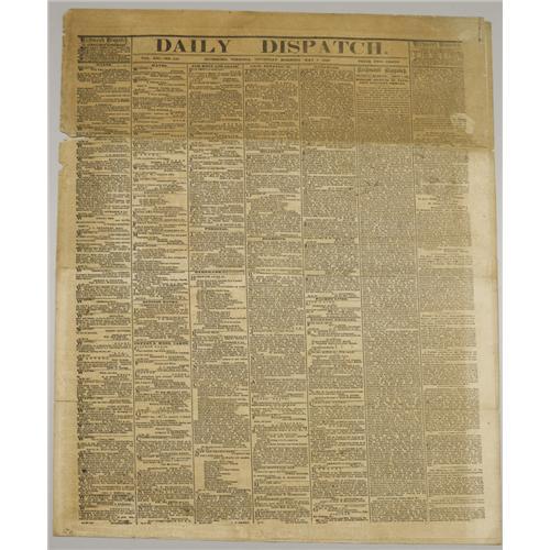 <B>Collection of Confederate Richmond Newspapers</B></I> including eight issues of the <I>Daily Dispatch</B></I> as follows: August 6, 1861; September 23, 1861; September 25, 1861; October 9, 1861; December 7, 1861; December 9, 1861 (some damage with text loss); April 23, 1862 (separating at fold); and May 1, 1862 (separating at fold). These are all complete four page issues with war news on the front page and multiple runaway slave advertisements. Generally very good condition except as mentioned. <BR><BR>Also included in this lot are three issues of the <I>Sentinel,</B></I> also from Richmond, as follows: July 15, 1863 with the leading front page story "Casualties at Gettysburg"; November 4, 1863 (severely damaged- in pieces, possibly could be repaired); and December 28, 1863 (also poor condition). These <I>Sentinels</B></I> are all two page volume one issues.<BR><BR><b>Shipping:</b> Large Flat (<a target="_blank" href="http://www.heritageauctions.com/common/shipping.php">view shipping information</a>)