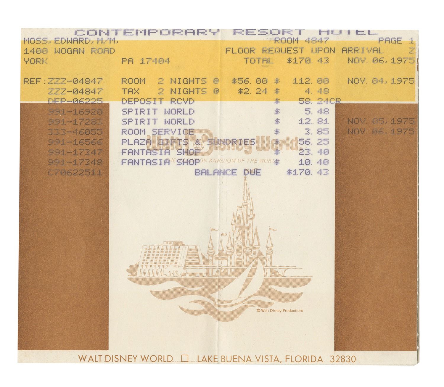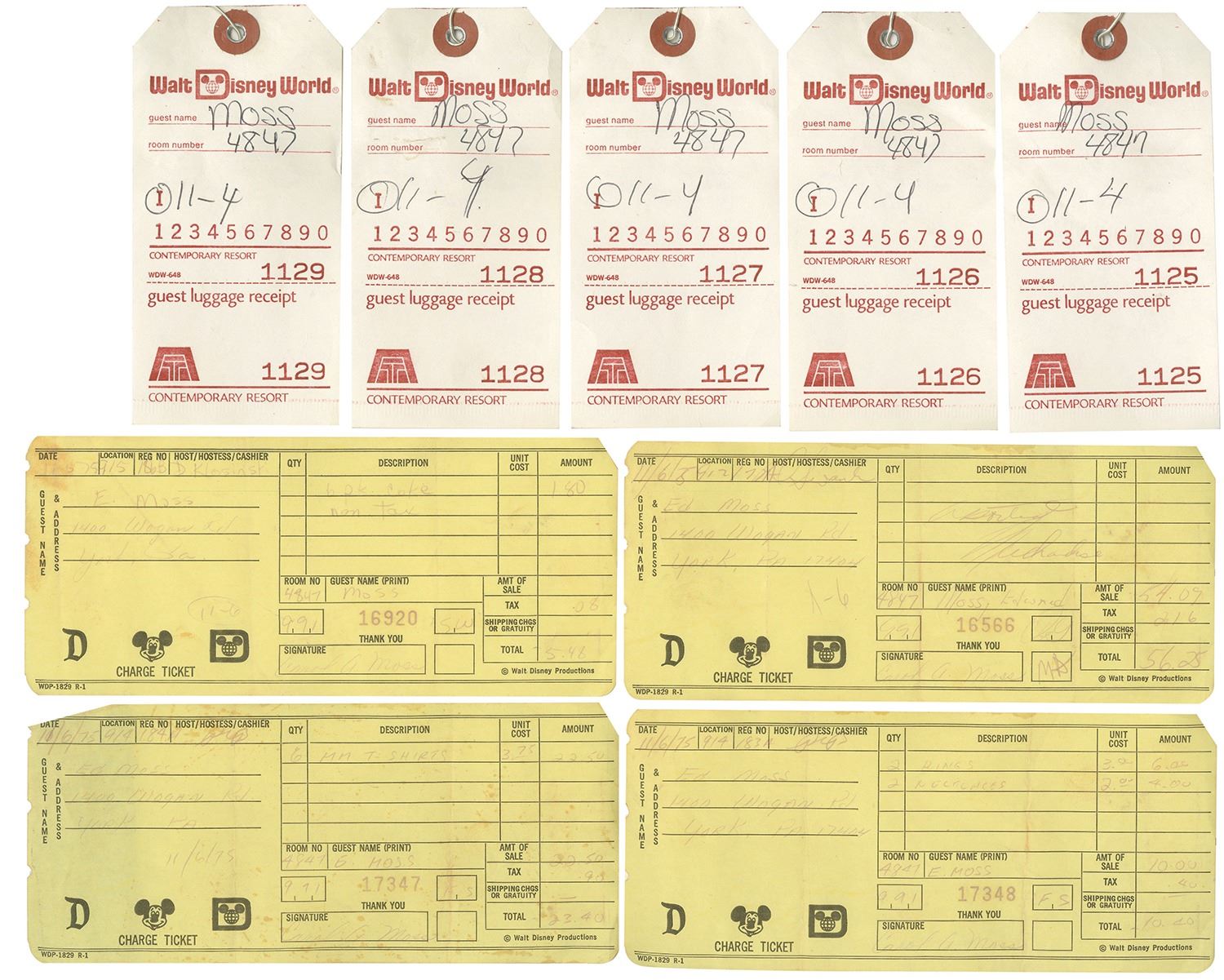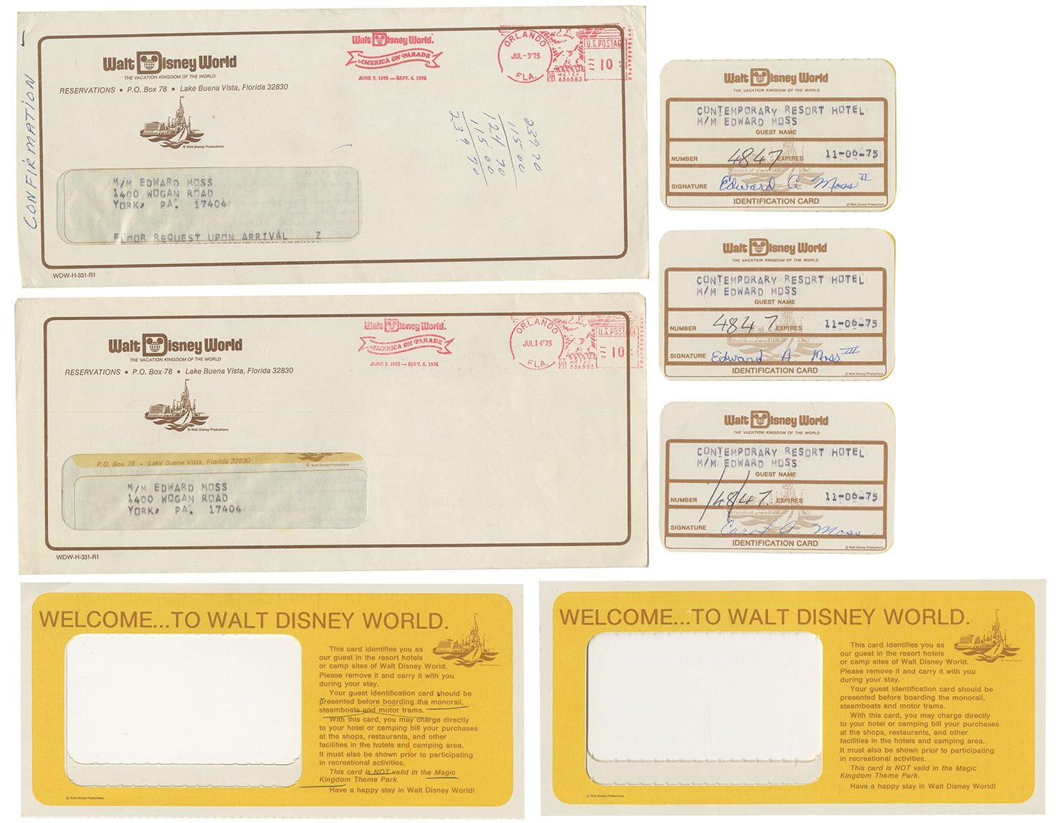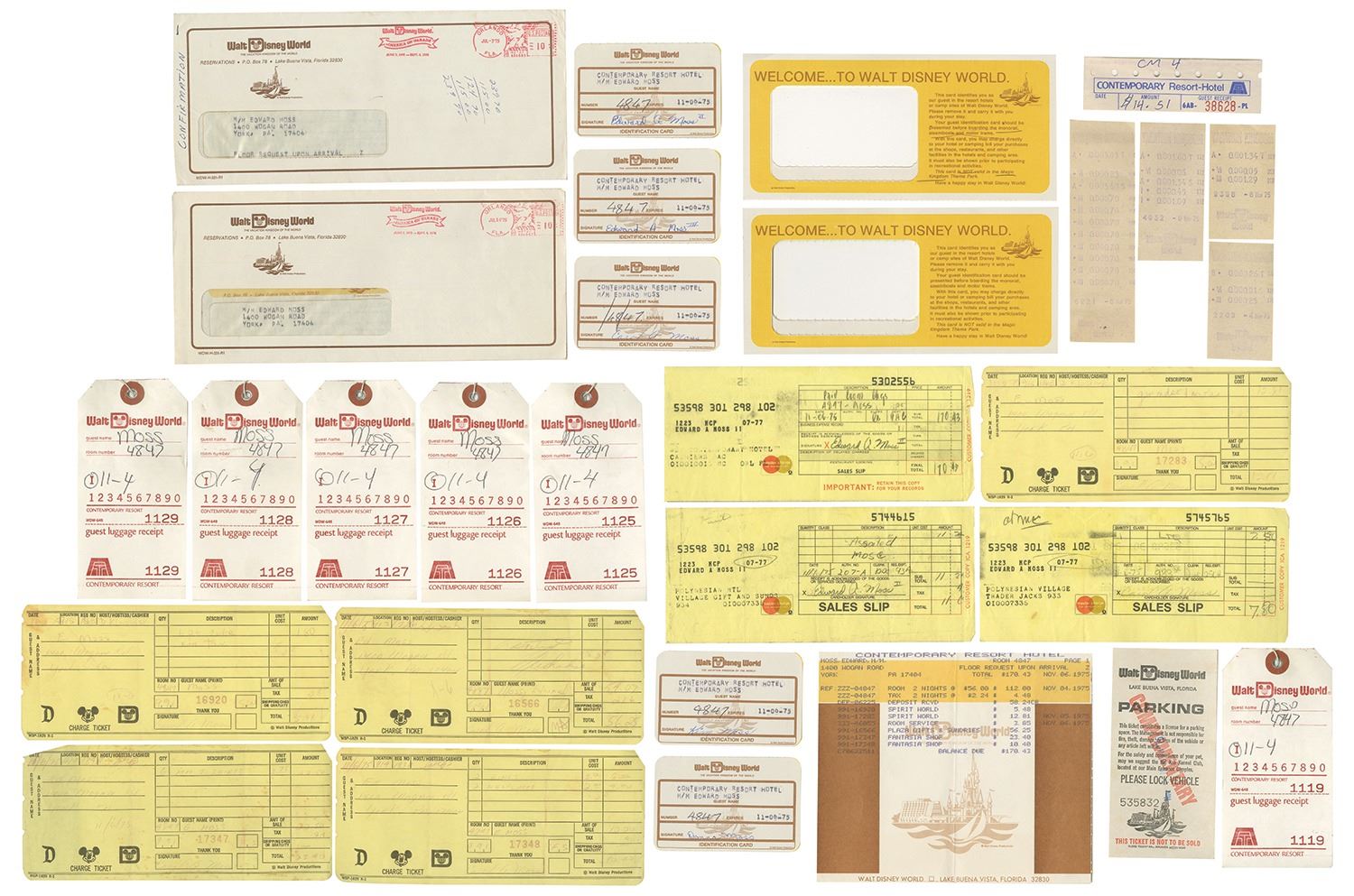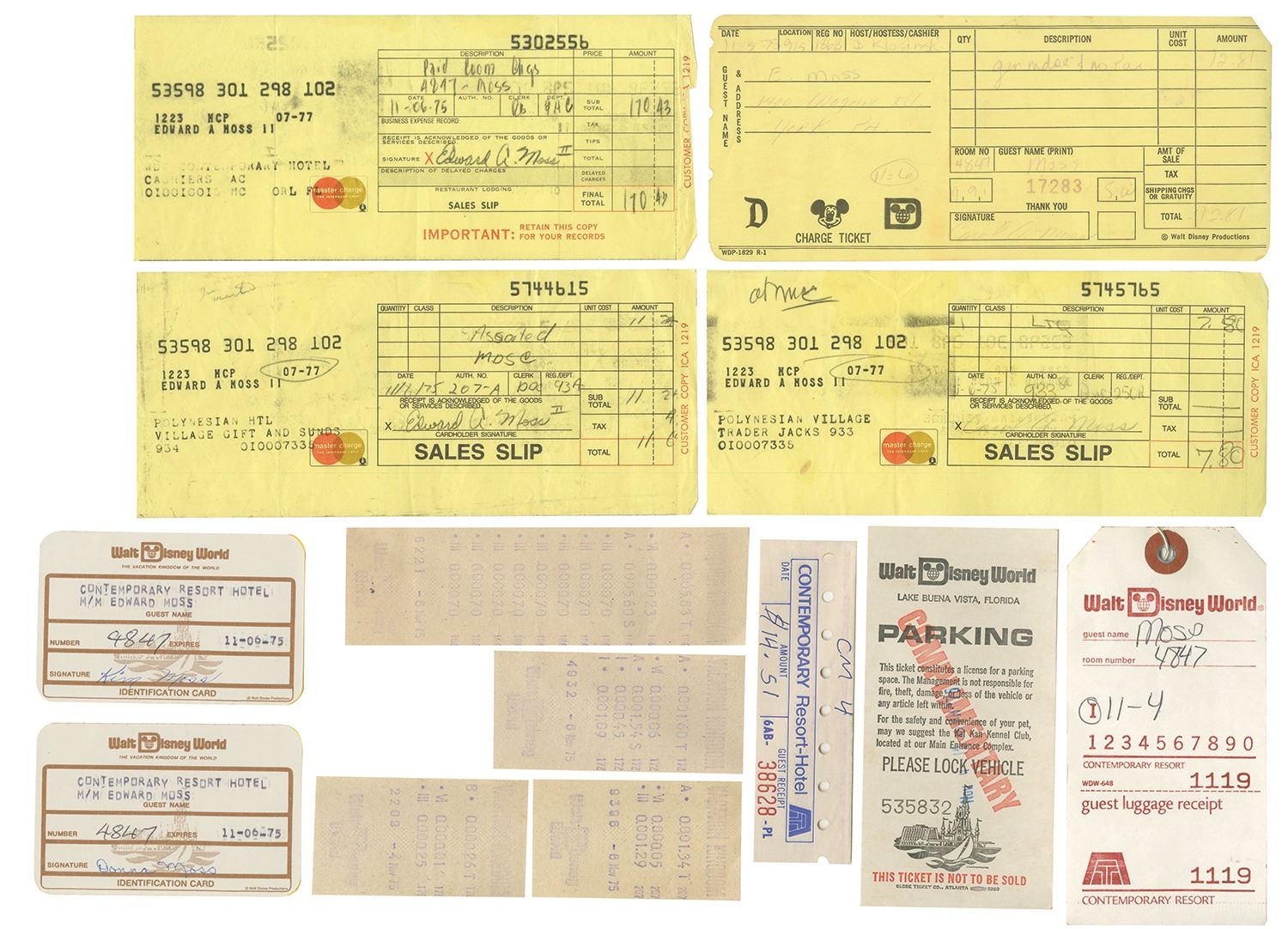 (Contemporary Resort, 1975-76) A large collection of paper items from a guest's visit to the Contemporary Resort. The items include (8) ticket receipts, (6) luggage receipts, (6) receipts from around the Hotel and park, a parking pass, (5) Walt Disney World identification cards, and (2) unopened letters from Walt Disney World to the guest. These paper items measure between 2.75"x1.75" and 4.25"x9.5". The collection is in good condition overall with some wear throughout from use.