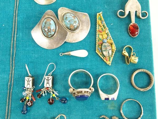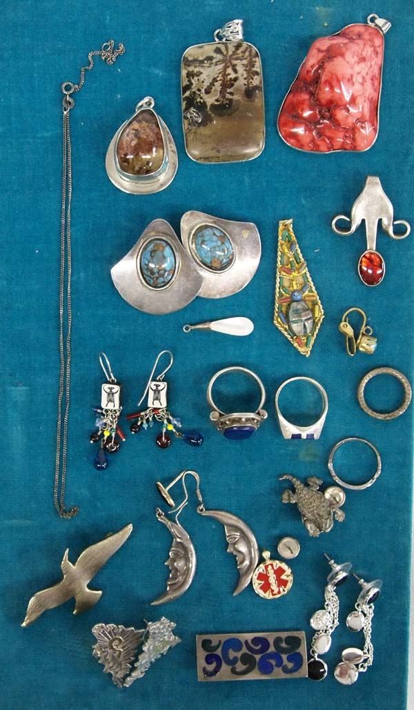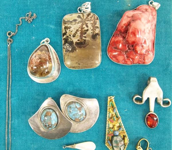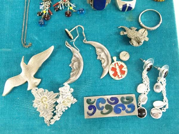 Collection of Costume Jewelry, Some Sterling, #1 Large Red Stone Pendant measures 2.25''L x 1.5''W, #2 Dendritic Agate Pendant, #3 Copper in Resin Sterling Pendant, #4 Sterling Turquoise Post Pierced Earrings, #5 Scarab Pendant, #6 Fork Pendant, #7 Ethnic Beaded Earrings, #8 Mexican Sterling Ring, #9 Sterling Lapis Ring, #10 Small Gold Rhinestone Ring, #11 Single Earrings, #12 Rhinestone Ring, #13 Horned Toad Tie Tack, #14 Ladybug Earrings, #15 Single Sterling and Mother of Pearl Earrings, #16 Sterling Crescent Moon Earrings, #17 Medical Charm, #18 Silvertone Dangle Earrings, #19 Metal Seagull Pin, #20 Signed Freeform Earrings, #21 Heavy Sterling Enamel Pin which is 12.91g in wt.
