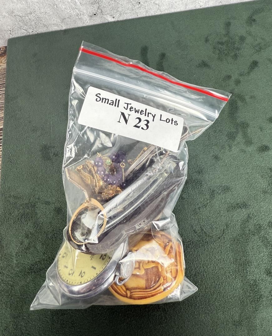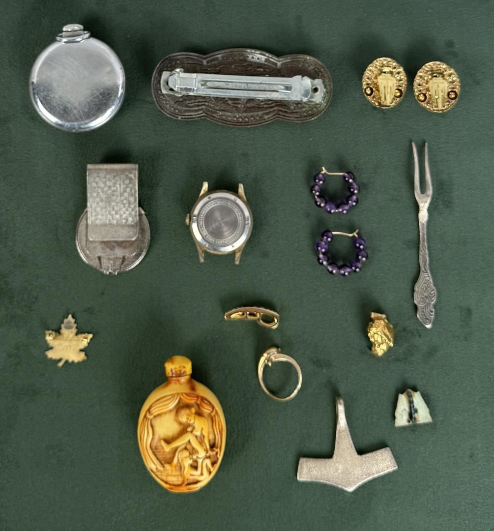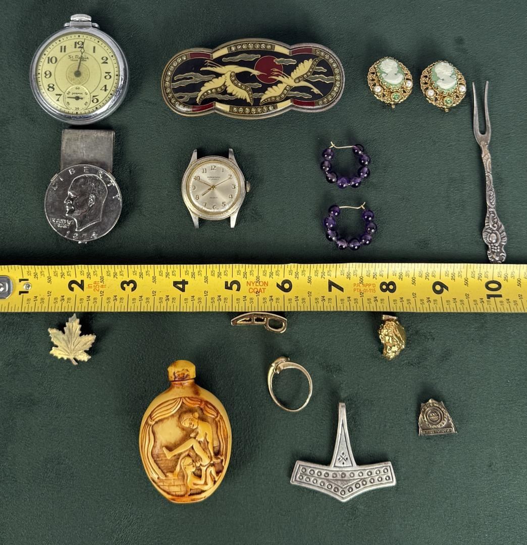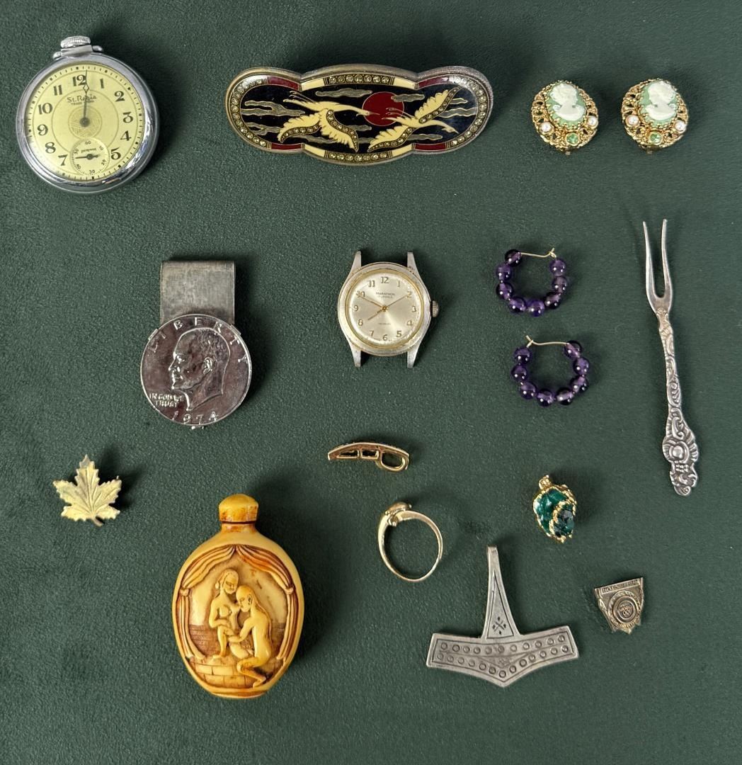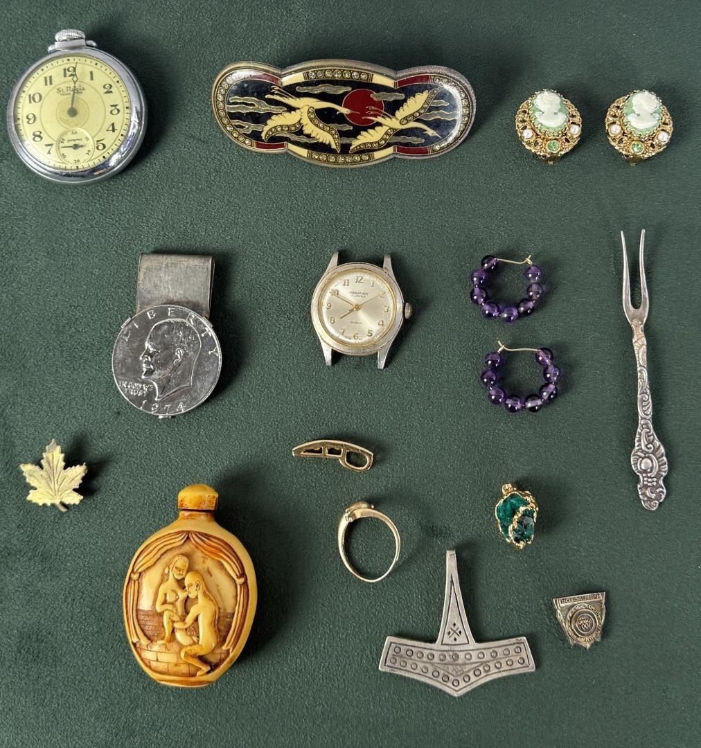 Including erotic snuff bottle, Viking Thor's hammer pendant, brutalist emerald pendant, working St. Regis pocket watch. Wrist watch does not work.