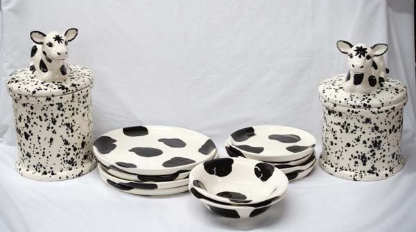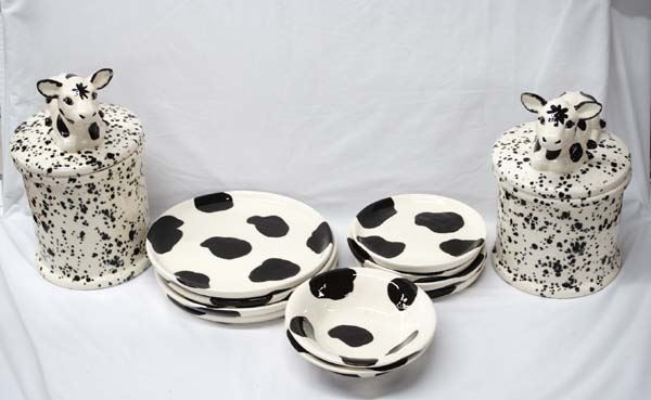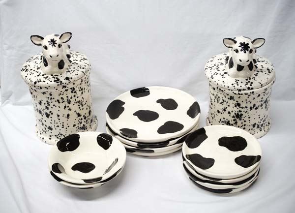 Collection of Cow Canisters and Dishes, MUST BE PICKED UP, includes 4 lunch plates, 4 salad plates, 4 bowls, and 2 canisters