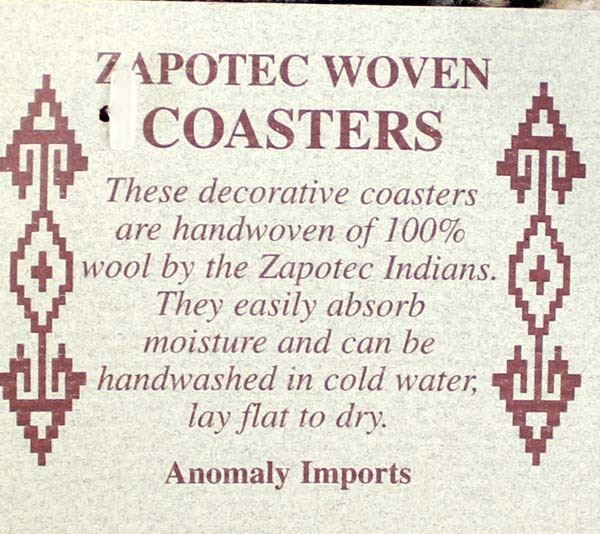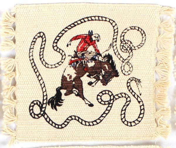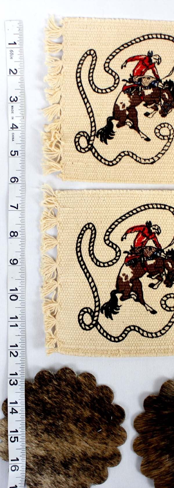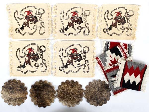 Collection of Cowboy Western Coasters, includes 4 cowhide coasters, 4 Zapotec 100% Wool coasters, and 5 Bucking Bronco 100% Cotton coasters. Largest measures 6'' x 6''