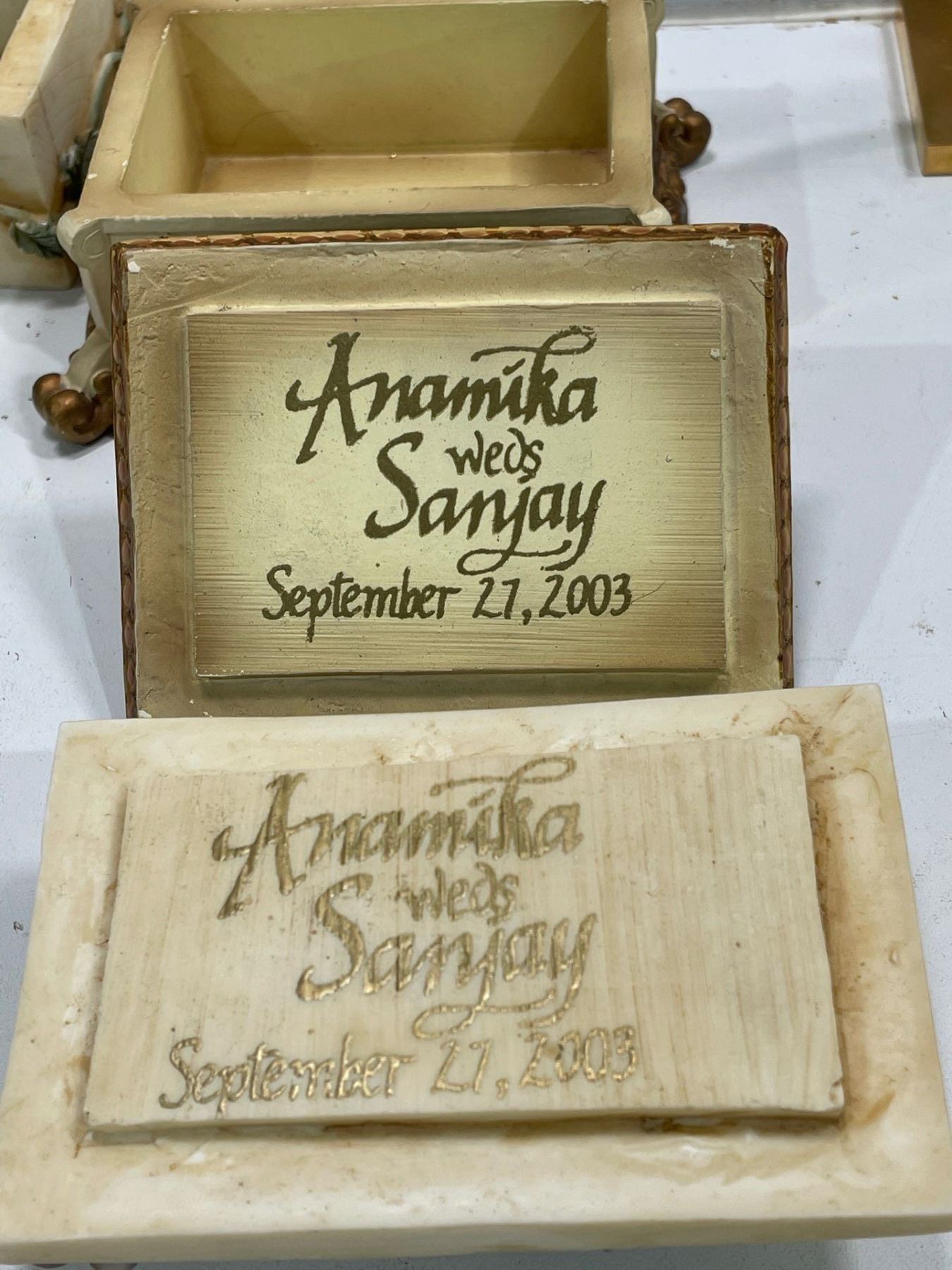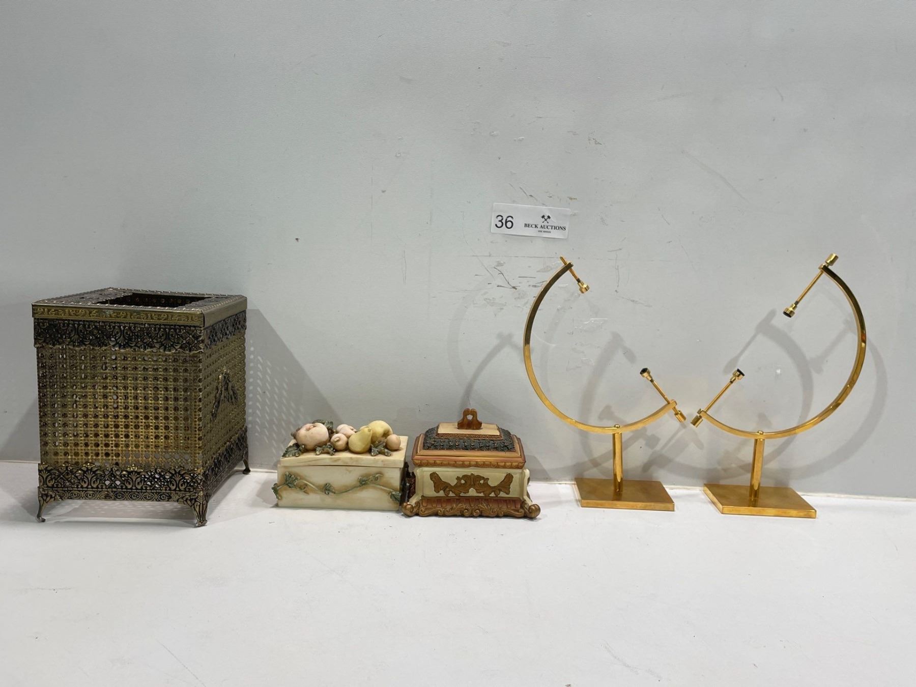 Collection of Decor Items: Tissue Box Holder, with 2 small boxes w/ Slope Ornament display stands