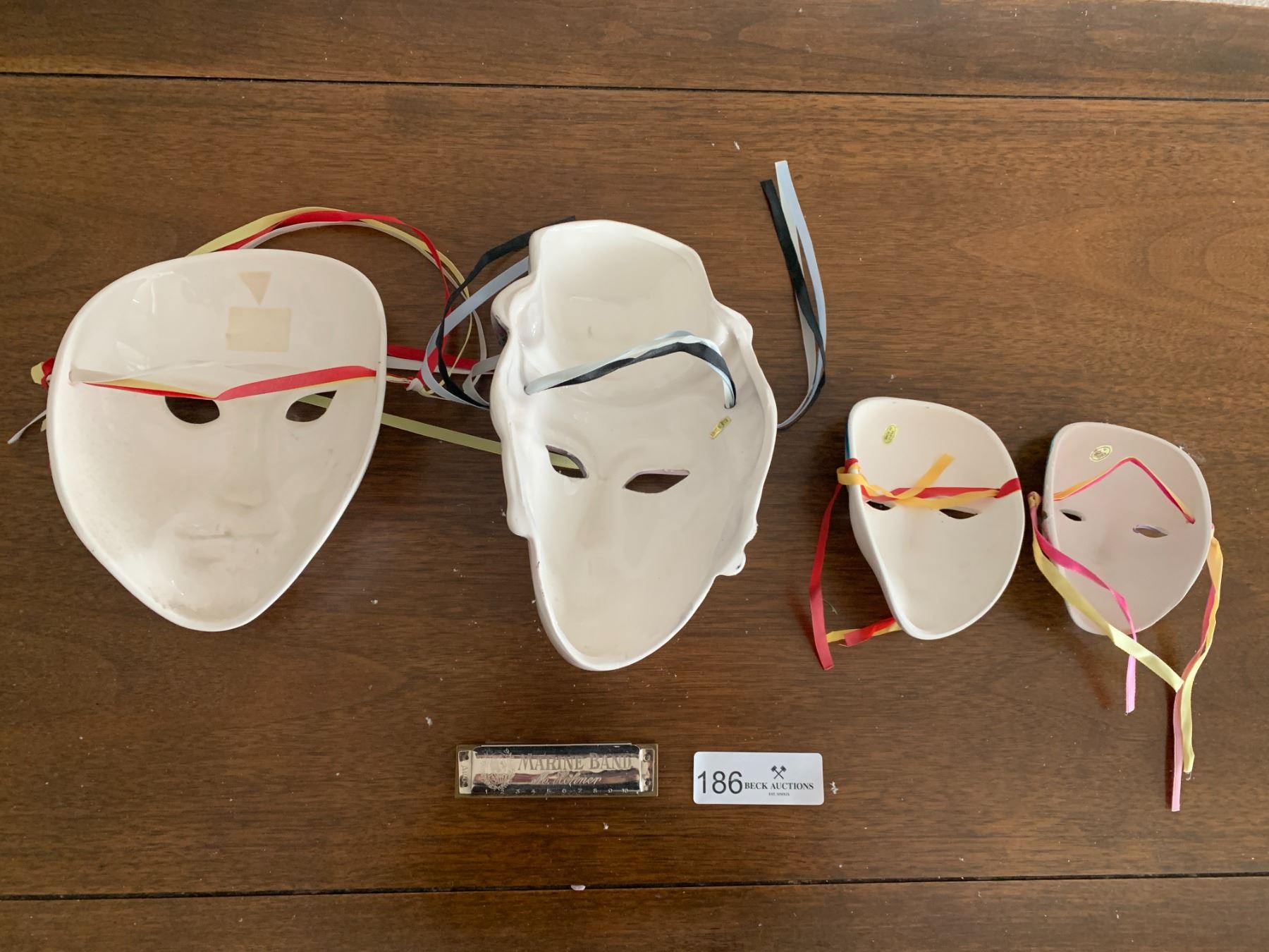 Collection of Decorative Ceramic Mardi Gras Masks & Vintage Hohner Marine Band Harmonica (Key of A)