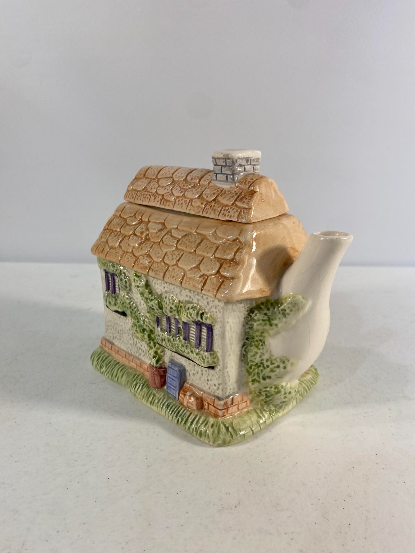 Charming assortment of five ceramic pieces including two floral teapots with blue ruffle trim, one cottage-shaped teapot, a cream teapot with pink flowers, and a rose-patterned sugar jar. Approx. 4"8" tall Condition: Good; minor wear and light crazing consistent with age.