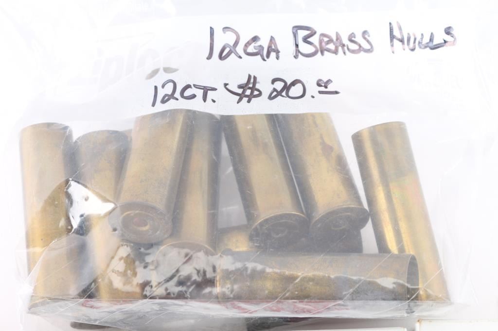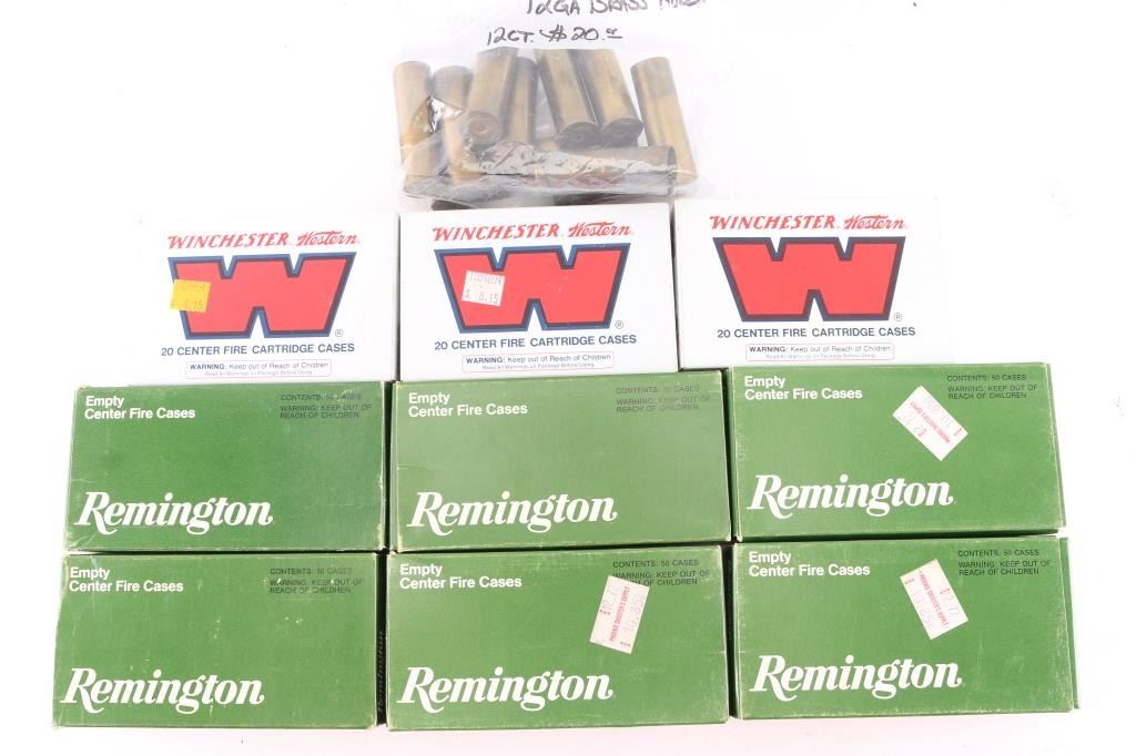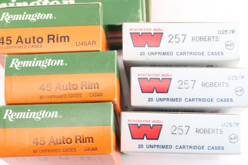 Includes twelve 12 Gauge Brass Hulls - 2 5/8" made by U.M.C. Co., sixty .257 Roberts brass cases - by Winchester, new unprimed in three 20 round boxes, and 300 .45 Auto Rim - by Remington, new in six fifty round boxes.