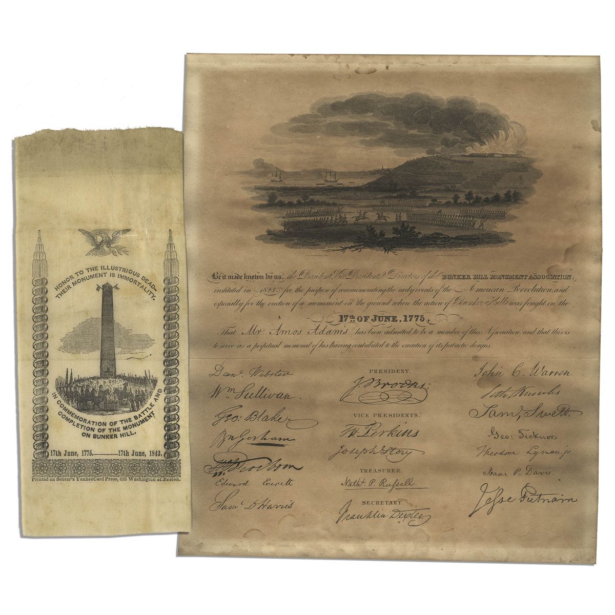 Signed Bunker Hill Monument Association Framed Document of Bunker Hill Soldier ''Amos Adams'', also an 1843 Bunker Hill Monument Ribbon, plus an Association Proceedings & Centennial Celebration book and an 1875 Bunker Hill Memorial Booklet.