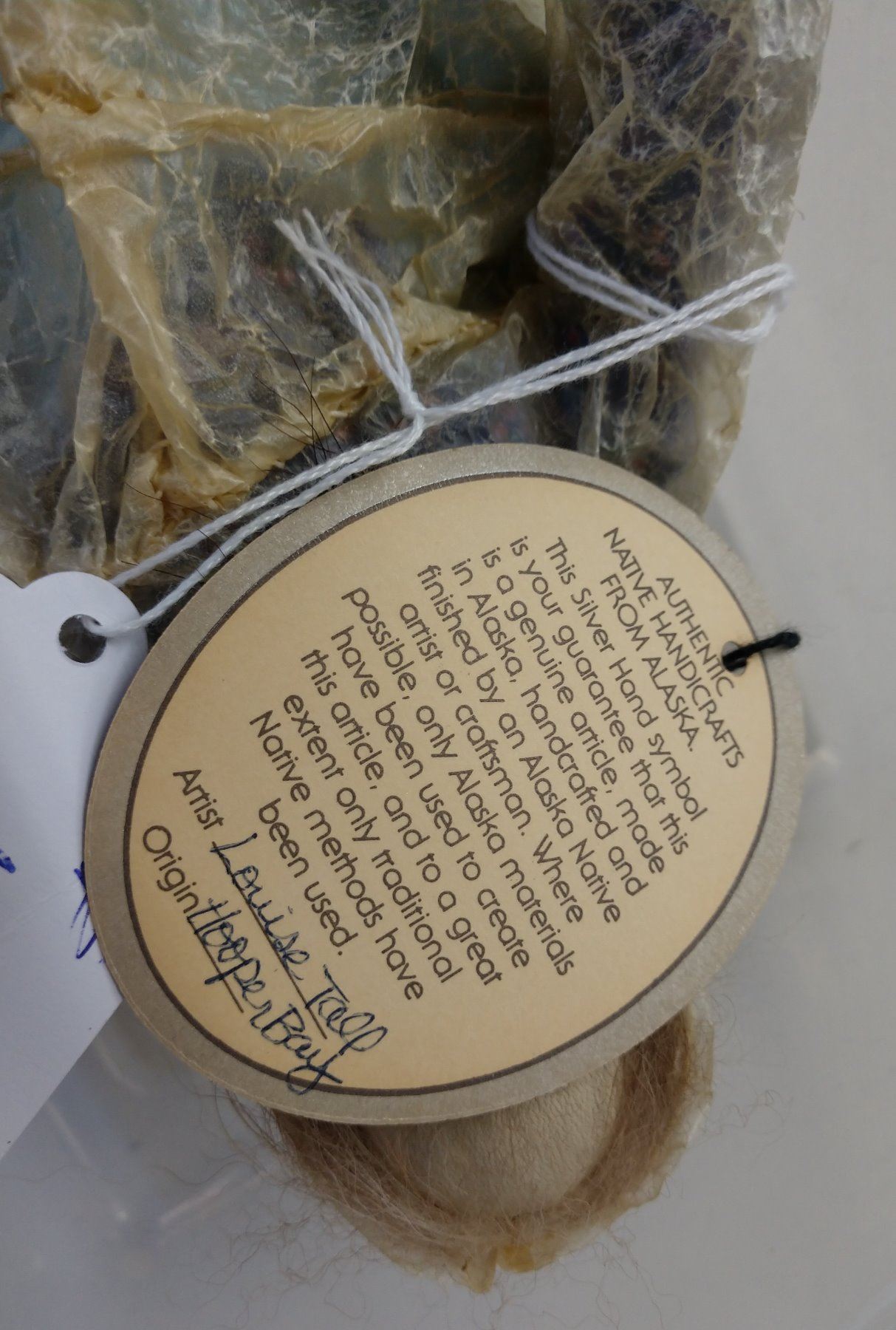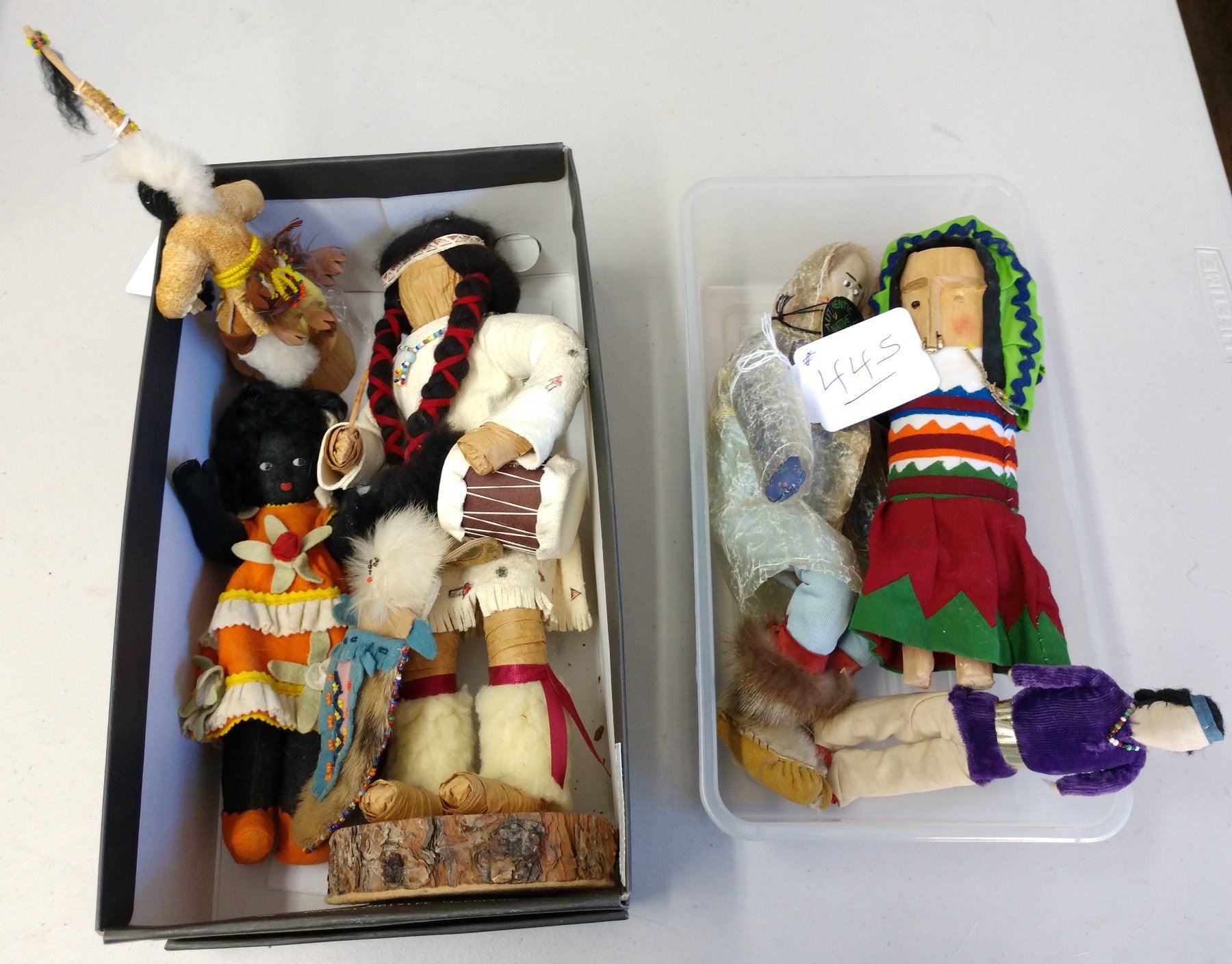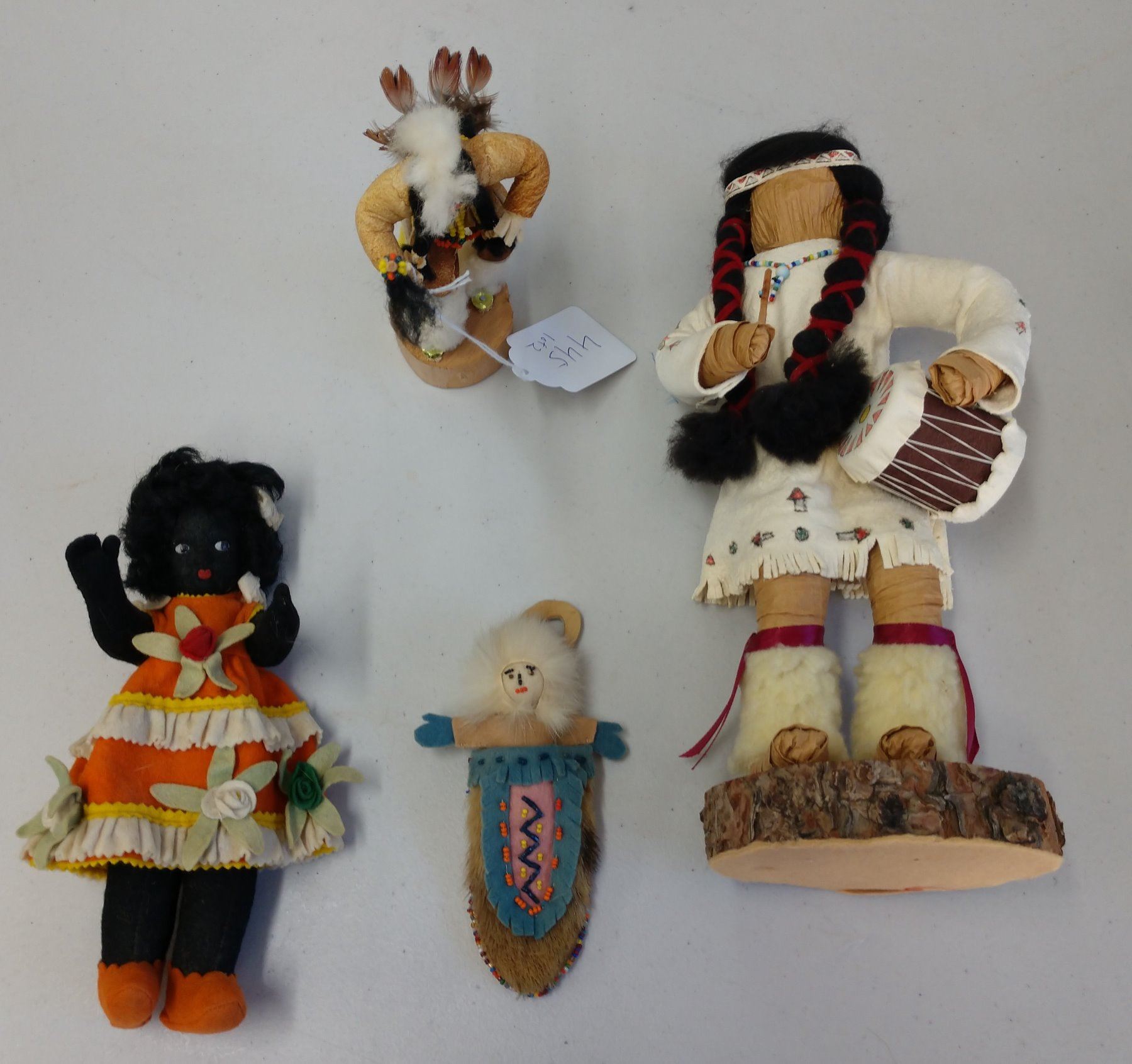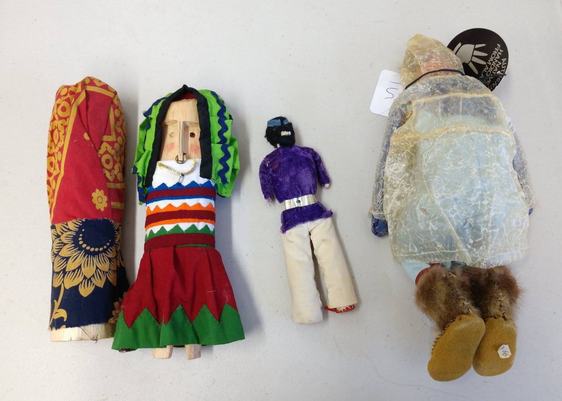 Collection of Dolls, c. 1950s and later. Made of fur, hide, wood, cloth, leather, corn husks, and glass, the largest measures 15". Pair from Panama, Alaska, 1 smaller Navajo doll, 2 Nez Perce dolls, and 1 Blackfoot folk art. Condition: Some wear, see images. Shipping: $35.00 w/insurance and signature, due to size.
