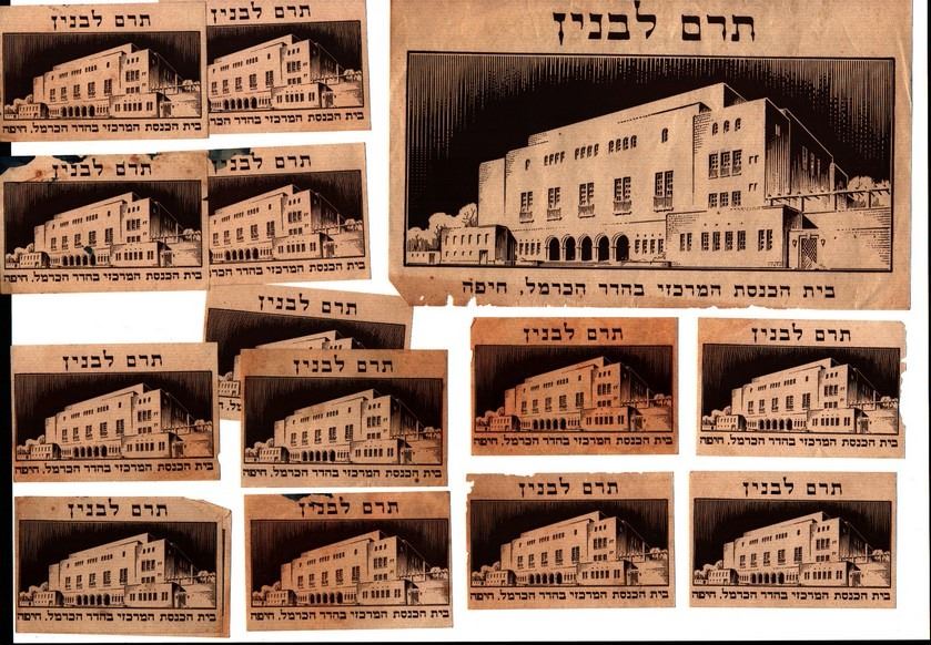 Collection of 'Donate to the Building' stickers of the main synagouge in Hadar Carmel Haifa: a large sticker and 14 smaller stickers. In different conditiond: large sticker has tears on the lower part, some have stains and minor tears on margins. Dimensions: Large sticker: 14x24 cm, small sticker: 6x9.5 cm.