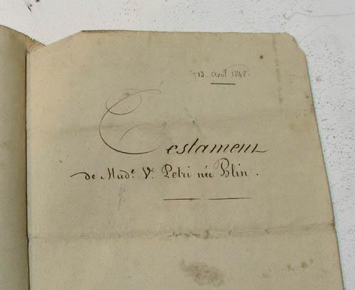 Signature: inscribed "Testament de Madame Peta nee Blin"