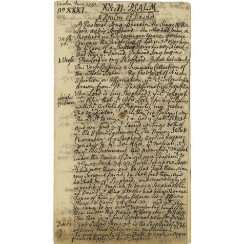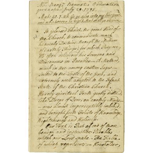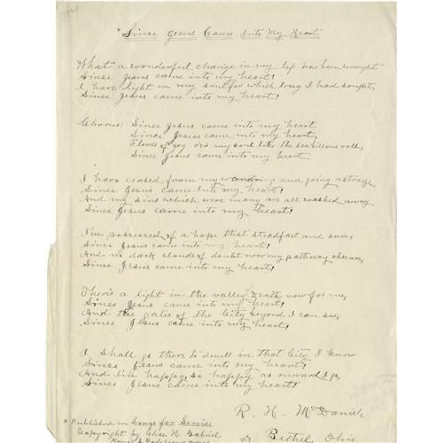 <B>Collection of Early American Religious Writings and Sermons</B></I> consisting of hymns, sermons, and various letters totaling more than a dozen items. Just a few of the great pieces are described below: <BR><BR>C. C. Dawson, 19th century hymn writer. The words and music to "Be Ye Perfect," four verses "Be Ye Perfect" AMsS, "Rejoice Evermore" AMs/MQS. <BR><BR>Thomas S. Hastings, hymn writer. "Christian Submission" AMs <BR><BR>Ezra Ripley, long-time Concord, Massachusetts pastor, step-grandfather of Ralph Waldo Emerson. 1810 ALS. <BR><BR>James Freeman, Boston minister. 1811 ALS. <BR><BR>Ezra Griswold, Worthington, Ohio founding father. 1812 ALS to Bishop Griswold of Rhode Island. <BR><BR>R. H. McDaniel, hymn writer. "Since Jesus Came Into My Heart" AMsS. <BR><BR>Daniel Rogers, pastor of the Second Parish Church in Exeter, New Hampshire 1744-1785. Handwritten sermon on Psalm 23 dated 1751. <BR><BR>Generally good to very good condition. From the Henry E. Luhrs Collection.