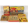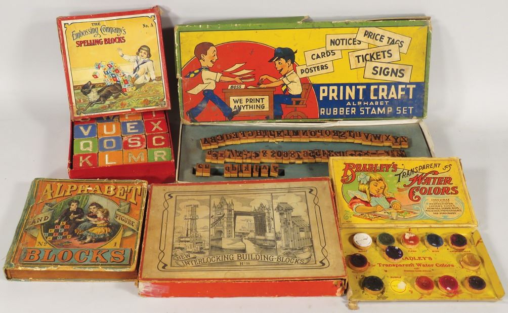 Collection of Early Childrens Games. Alphabet and Figure Blocks (incomplete), Bradley's Transparent Water Colors, The Embossing Company's Spelling Blocks-No. A, New Interlocking Building Blocks-No. 1 1/2, Print Craft Alphabet Rubber Stamp Set. Overall fair condition.