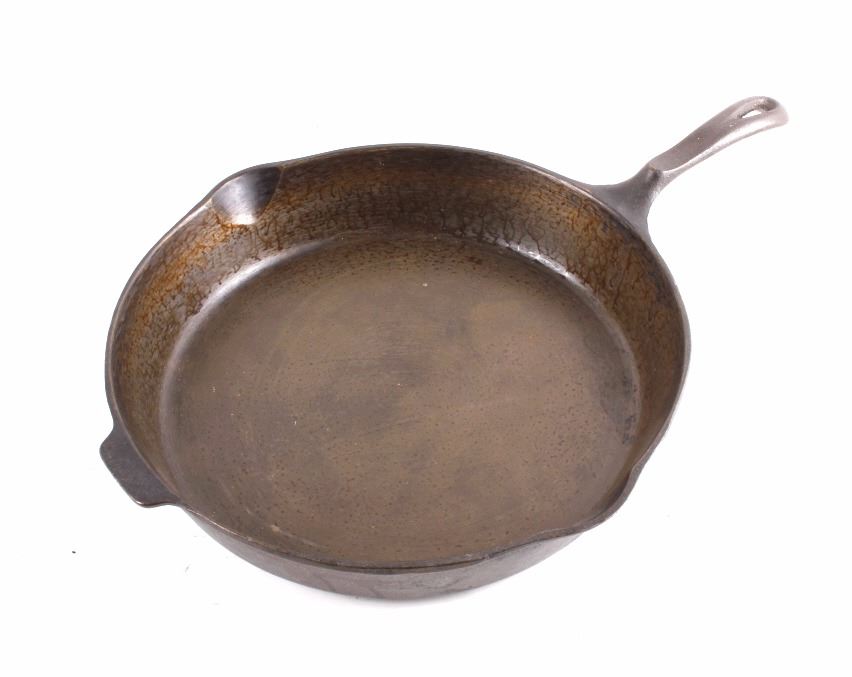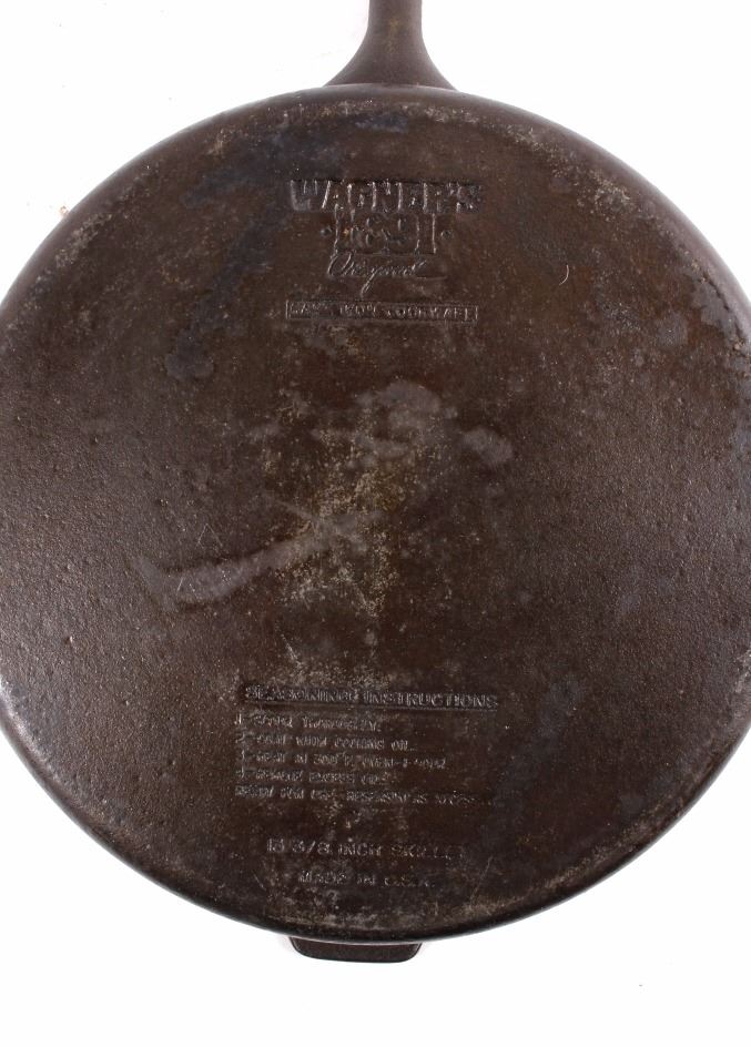 This lot features a collection of three early fry pans. First fry pan, in this lot, is a Late Wagner No. 8. The official start of the Wagner Manufacturing Company was in 1891. However, the Wagner brothers, Bernard and Milton, actually started making metal castings of light hardware for general stores back in 1881. Next up is a Late Lodge no. 10 with Ho ring. Finally, we have a Wagner 1891 no. 12 fry pan. The overall condition of the set is good. Measure: ( In order listed above) 11" Diameter x 2" H, 12 1/2" W x 2"H, 14" Diameter x 2" H