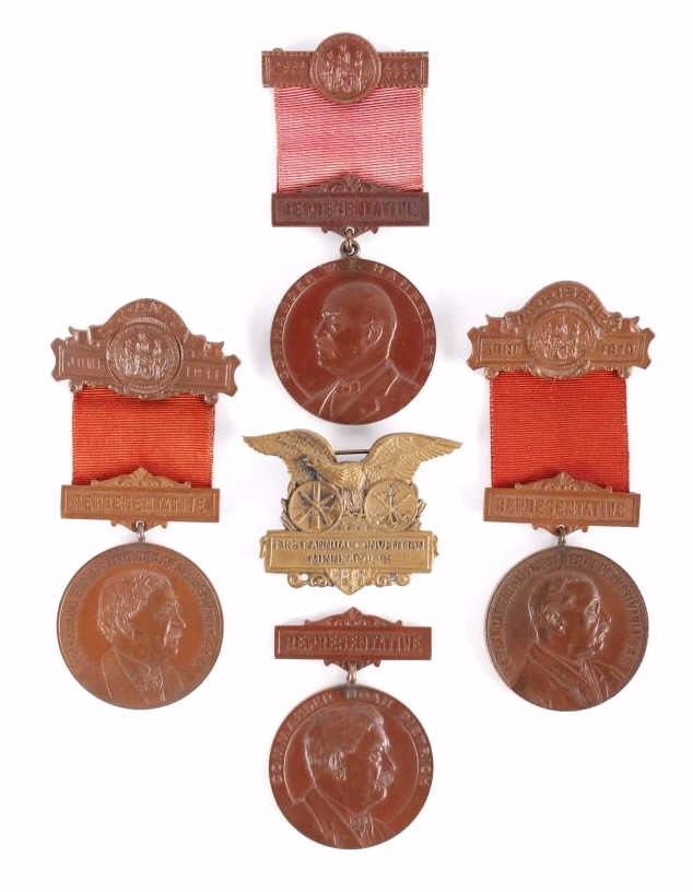 This lot gives you the chance to bid on a set of four Grand Army of the Republic Encampment medals. The lot also includes a "First Annual Convention - Minneapolis - NOV 1919" pin. The G.A.R. Pins range in date from 1910 - 44th Annual - Harrisburg PA, 1911 - 45th Annual - Scranton OH, 1918 - 52nd Annual - Danville, and lastly a 1923 - 57th Annual - Greensburg. The bronze accoutraments were given to attending Civil War veterans of the given annual event. The GAR held its first conference in 1866, and its last in 1956. These pins are a great piece of Union memorabilia, or militaria. The lot is in good condition, there is some slight patina forming on some of the pins where the hanging ring is brazed to the medals. The 1910 medal measures 4" long, and 1 3/4" wide. The medals are displayed in a riker case which measures 12" wide, 8 1/4" tall, and 3/4" deep.