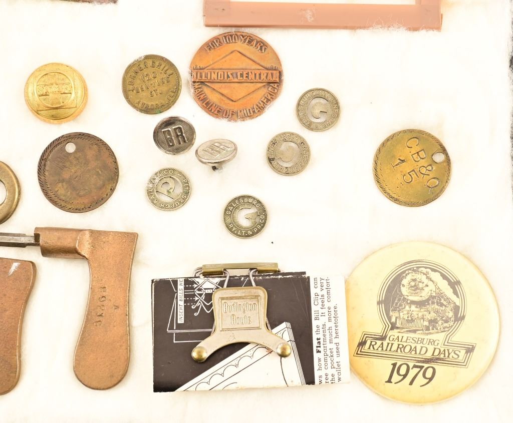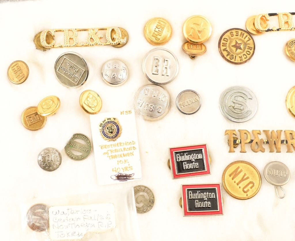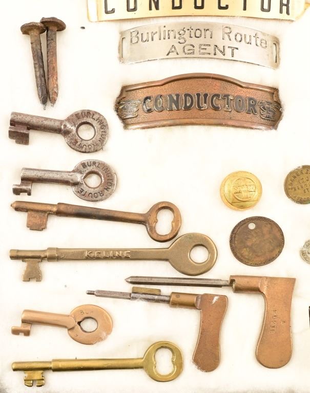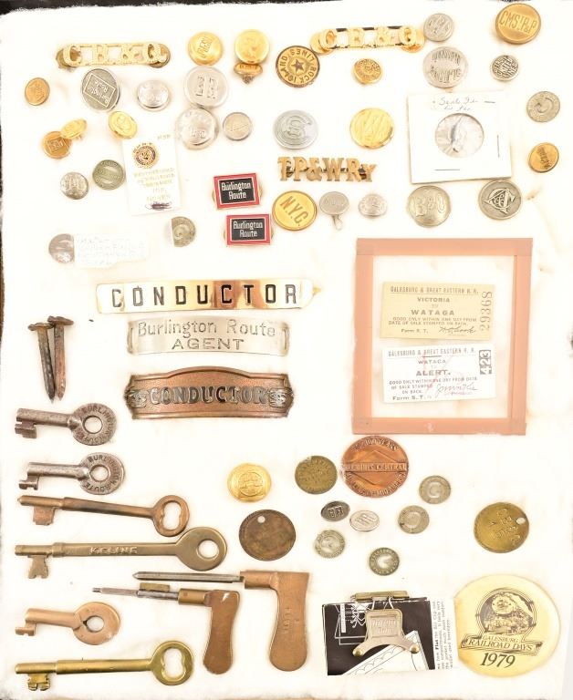 Includes buttons, keys, pins, collector coins, conductor name plates. Brotherhood of Railroad Trainmen 10k 40 year pin .