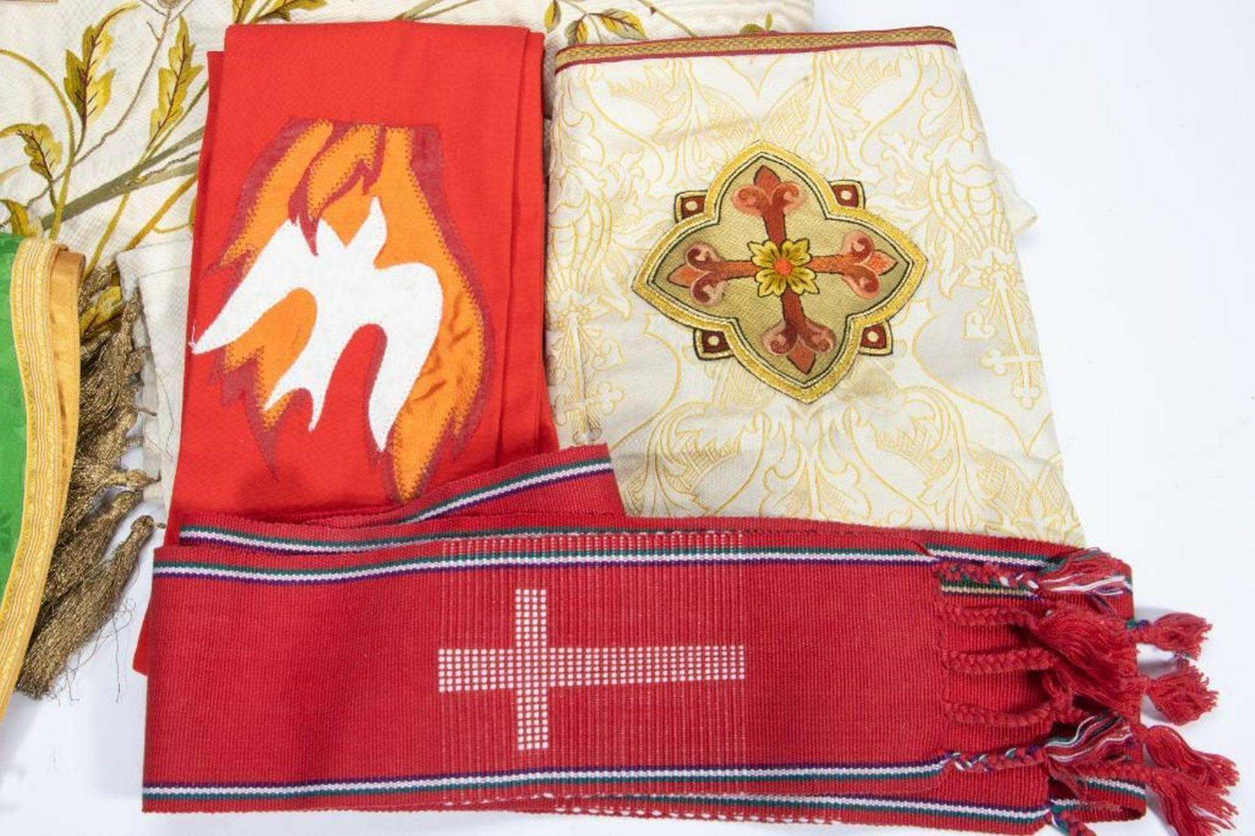 Including six Orthodox stoles and two others, a moire silk gold-embroidered and fringed altar textile (approx. 10ft. long, 16 1/2in. wide), and a framed embroidery cross on silk (10in. x 7 3/4in.). The stoles and cap are in good condition. The altar textile has staining/yellowing on both sides, a few areas of wear to the moire, but the fringe and embroidery are in good condition.