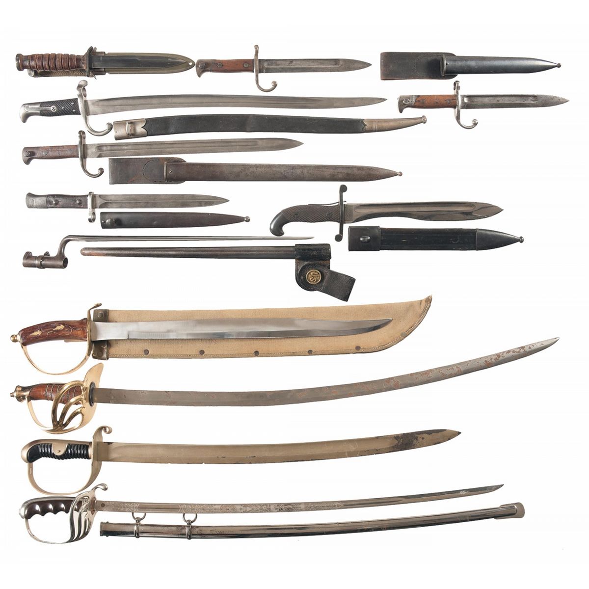 1) Camillus USM3 knife with sheath. 2) Remington No. 5 bayonet. 3) Remington No. bayonet with sheath. 4) Weyersburg sword bayonet with sheath. 5) Remington rolling block long bayonet with sheath. 6) Unmarked Mauser bayonet with sheath. 7) Spanish WWI era Bolo knife with sheath. 8) 1873 pattern Trapdoor Springfield bayonet with sheath. 9) Pakistan marked short sword with canvas sheath. 10) Unmarked sword. 11) 1902 pattern Army Officer's sword with scabbard. 12) Unmarked sword.