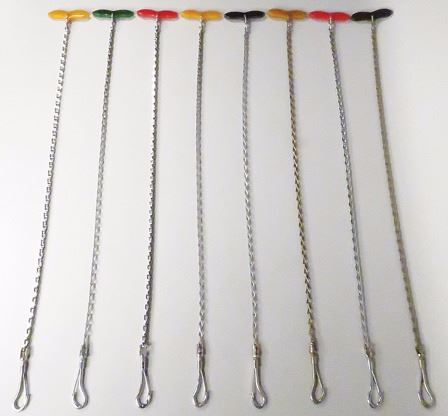 Collection of Eight Celluloid Handled Dog Chains. Red, green, black and yellow. Each measures 24 inches long.