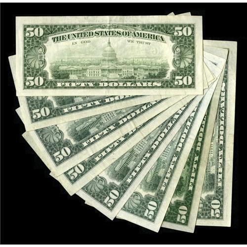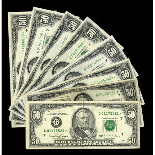<B>Collection of Eight Chicago Star $50 FRNs including</B></I> 1934; 1963A (2); 1969; 1969C; 1974; 1985; and 1990. All of the stars grade in the <B>Fine to VF-XF</B></I> neighborhood. A couple of the notes have pinholes.<BR><I>From The Bill and Kathy Stella Currency Collection</B></I><BR><BR><b>Shipping:</b> Coins & Currency (<a target="_blank" href="http://www.heritageauctions.com/common/shipping.php">view shipping information</a>)