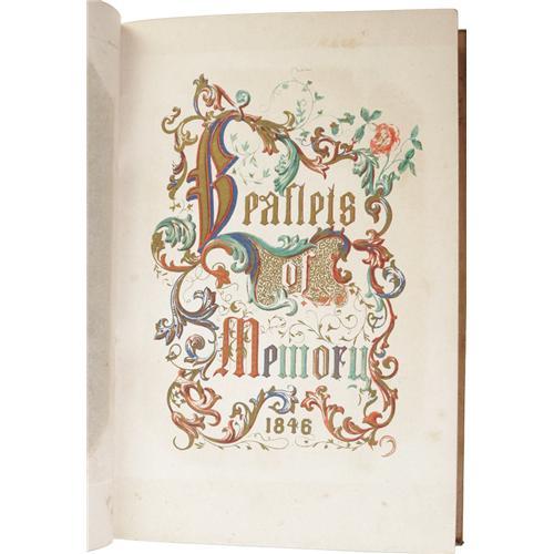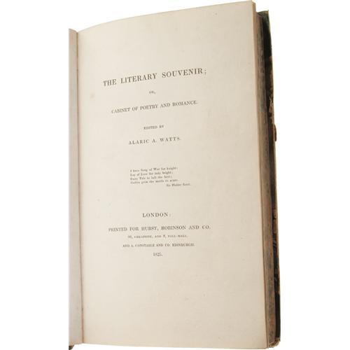 <B>Collection of Eight Nineteenth Century Books.</B></I> Reynell Coates, editor: <I>Leaflets of Memory; An Annual for 1846</B></I> (Philadelphia: E. H. Butler & Co., 1846), first edition, 306 pages, full calf with gilt lettering and decoration, gilt edges, 8vo (6.75" x 9.5"), no dust jacket. Boards soiled, and foxing mostly around plates. The binding is tight.<BR><BR>Alaric A. Watts: <I>The Literary Souvenir; or, Cabinet of Poetry and Romance</B></I> (London: Hurst, Robinson and Co., 1825), 393 pages, half-leather with marbled boards and edges, 8vo (4.75" x 7.5"), includes 3 pages of facsimiles of "Autographs of the Living Poets" plus 10 engravings, and also includes "Firouz-Abdel; a Tale of the Upas Tree" by David Lyndsay (Mary Diana Dods). This copy is good, with foxing on and near plates, general edge wear, and rubbed boards. Previous owner's bookplate on front pastedown.<BR><BR> No Author : <I>Young Lady's Book</B></I> (London: Vizetelly, Branston, & Co., nd), 505 pages, half-leather with gilt lettering on spine and marbled endpapers and edges, 16mo (4.25" x 6.5"). This copy is very good, with the lower front corner rubbed, some staining to the leather, and foxing, which is largely limited to full-page plates. Missing title page. An attractive volume<BR><BR> No Editor : <I>The Snow Flake: a Christmas, New Year, and Birthday Gift</B></I> (New York: Leavitt and Allen, 1855), 263 pages, original leather boards with gilt decorative stamping and taped spine, all edges gilt, 12mo (5" x 7.25"). Includes Mary Shelley's "The Sisters of Albano". The book is good, with noticeable rubbing to the edges, and the textblock is tight but foxed and stained. Front hinge separated.<BR><BR>Dorothy Wellesley, editor: <I>The Annual: Being a Selection from the Forget-Me-Nots Keepsakes and other Annuals of the Nineteenth Century</B></I> (London: Cobden-Sanderson, nd), 296 pages, aqua paper boards with black lettering and decoration, 16mo (4.25" x 6.5"). There is a .5" tear at front and back edges of spine head, and the spine itself appears a bit sunned. Still, the textblock and boards are bright and clean.<BR><BR>S.C. Hall, editor: <I>The Book of Gems: The Modern Poets and Artists of Great Britain</B></I> (London: Henry G. Bohn, 1845), 304 pages (followed by 4 pages of facsimile signatures, including Percy B Shelley, Byron and Leigh Hunt), full green leather with gilt lettering and decorative stamping, all edges gilt, 8vo (5.5" x 8.5"). This copy is very good, with the spine and boards sunned, light rubbing to the head of the spine, and some foxing to the textblock. 1846 ownership writing on front pastedown.<BR><BR> No Editor : <I>Friendship's Offering: a Christmas, New Year, and Birthday Gift</B></I> (Boston: Phillips and Sampson, 1847), 316 pages, red leather with gilt lettering on spine and decorative blind stamping on the boards, all edges gilt, 12mo (5" x 7.5"). Includes Mary Shelley's poem "Stanzas". The boards and edges are noticeably rubbed . Hinges starting. Most of red covering on spine loose, with a .75" piece missing from the tail of the spine, and smaller piece from the head of the spine. Textblock is tight, but mostly foxed.<BR><BR> No Editor : <I>The English Annual</B></I> (London: Edward Churton, 1836), 376 pages, full leather with gilt lettering and decoration on spine and boards, all edges gilt, 8vo (5.5" x 8.25"). Includes Mary Shelley's "The Pole". The book is about very good, with the edges of spine and boards rubbed, foxing from the front free endpaper to the title page and some plates. Plate in back lightly stained, otherwise the textblock is tight, bright and clean. A fascinating collection for ant Shelley collector. <I>From the Betty Bennett Collection.</B></I><BR><BR><b>Shipping:</b> Books & Catalogs (<a target="_blank" href="http://www.heritageauctions.com/common/shipping.php">view shipping information</a>)