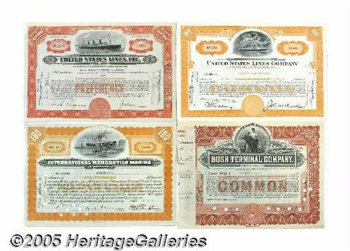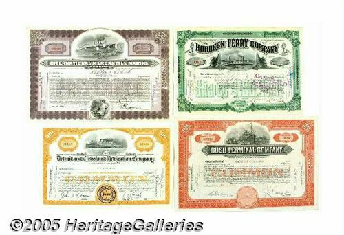 <B>Collection of Eight Shipping Stocks</B></I> Includes the following: 1. Bush Terminal Company shipping stock. New York, 1930, red. Printer - Republic Banknote. This was a railway and shipping terminal. 2. Bush Terminal Company shipping stock. New York, 1938, red. Quayle & Bros. New York printer. Rare. 3. Detroit & Cleveland Navigation shipping stock. Michigan, 1954, orange. Superb vignette of the steamship "Greater Detroit". 4. Hoboken Ferry company shipping stock. New Jersey, 1896, brown. Gorgeous Victorian style graphics with steamboat ferry "Bergen." Excellent. 5. International Mercantile Marine Company shipping stock. New Jersey, 1920, purple. Famous "Titanic" stock. This company owned White Star Lines and the Titanic. Two vignettes. Usual hole cancellation in vignette. Great. 6. International Mercantile Marine Company shipping stock. New Jersey, 1937, orange. Famous "Titanic" stock. This company owned White Star Lines and the Titanic. Usual hole cancellation in vignette spelling out "JPM & CO," which stands for J. P. Morgan & Co. Morgan controlled this company. One of his poorer investments. A classic. 7. United States Lines Company shipping stock. New Jersey, New York, 1947, shipping-cruise line stock. 8. United States Lines, Incorporated shipping stock. Delaware, Illinois, New York, 1931, red. Preferred stock. Shipping-cruise line. Very scarce type. The collection of eight great shipping stocks. A very popular topic with collectors. Lot:253