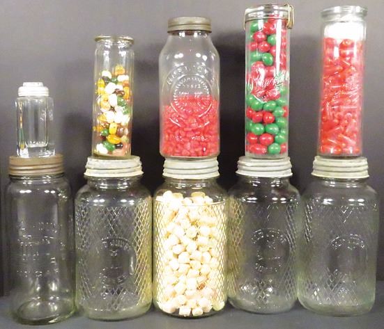 Collection of Embossed Glass Store Jars. Old Judge Coffee, Horlicks Milk, White House Vinegar, Bunte Candy and glass salt shaker, (10 pcs).