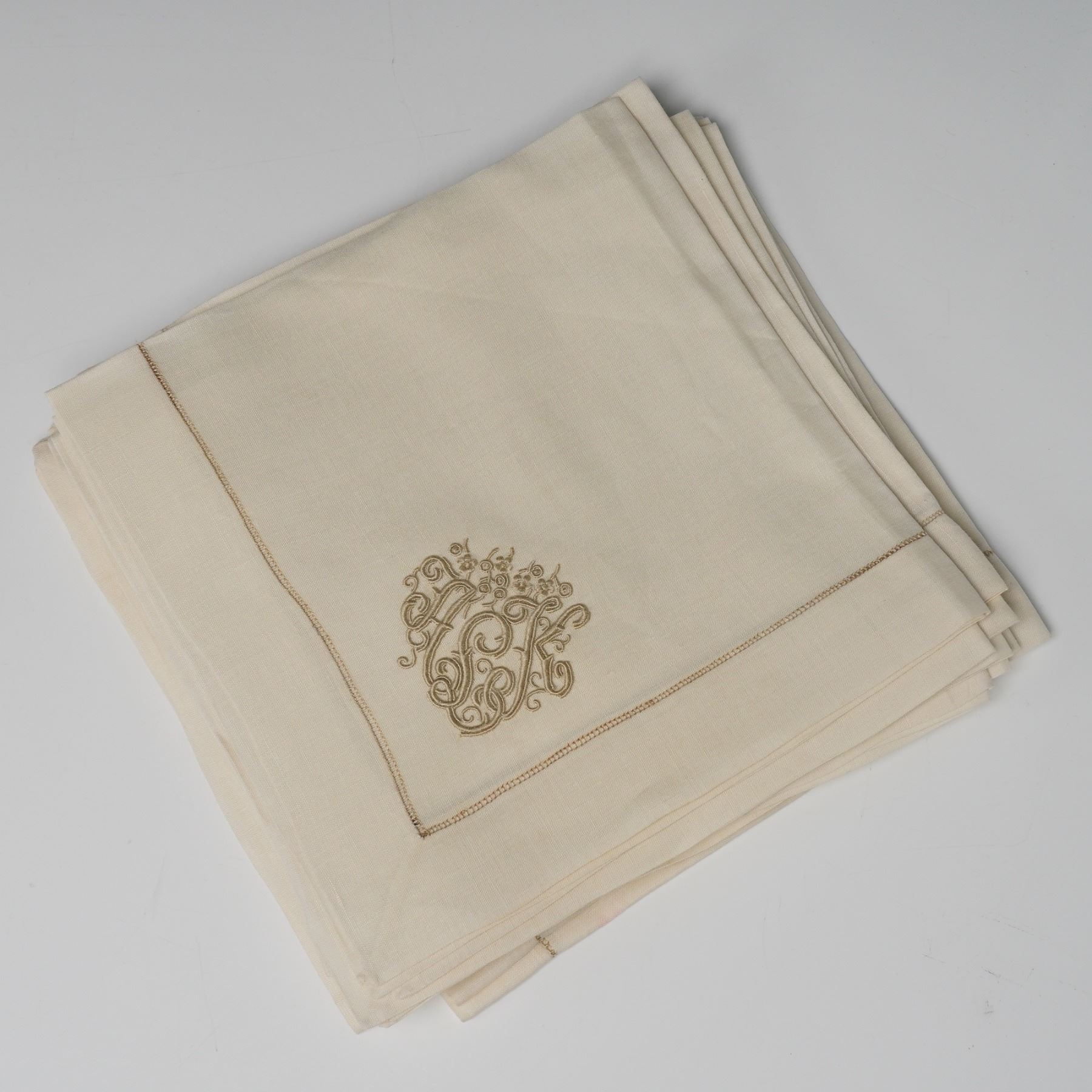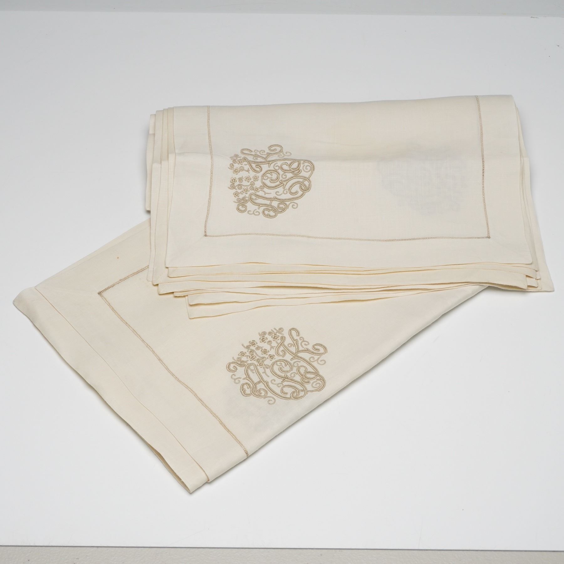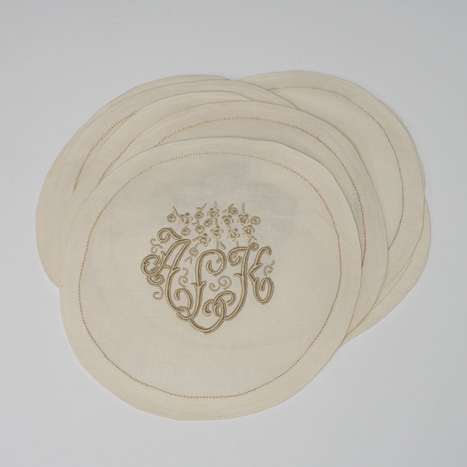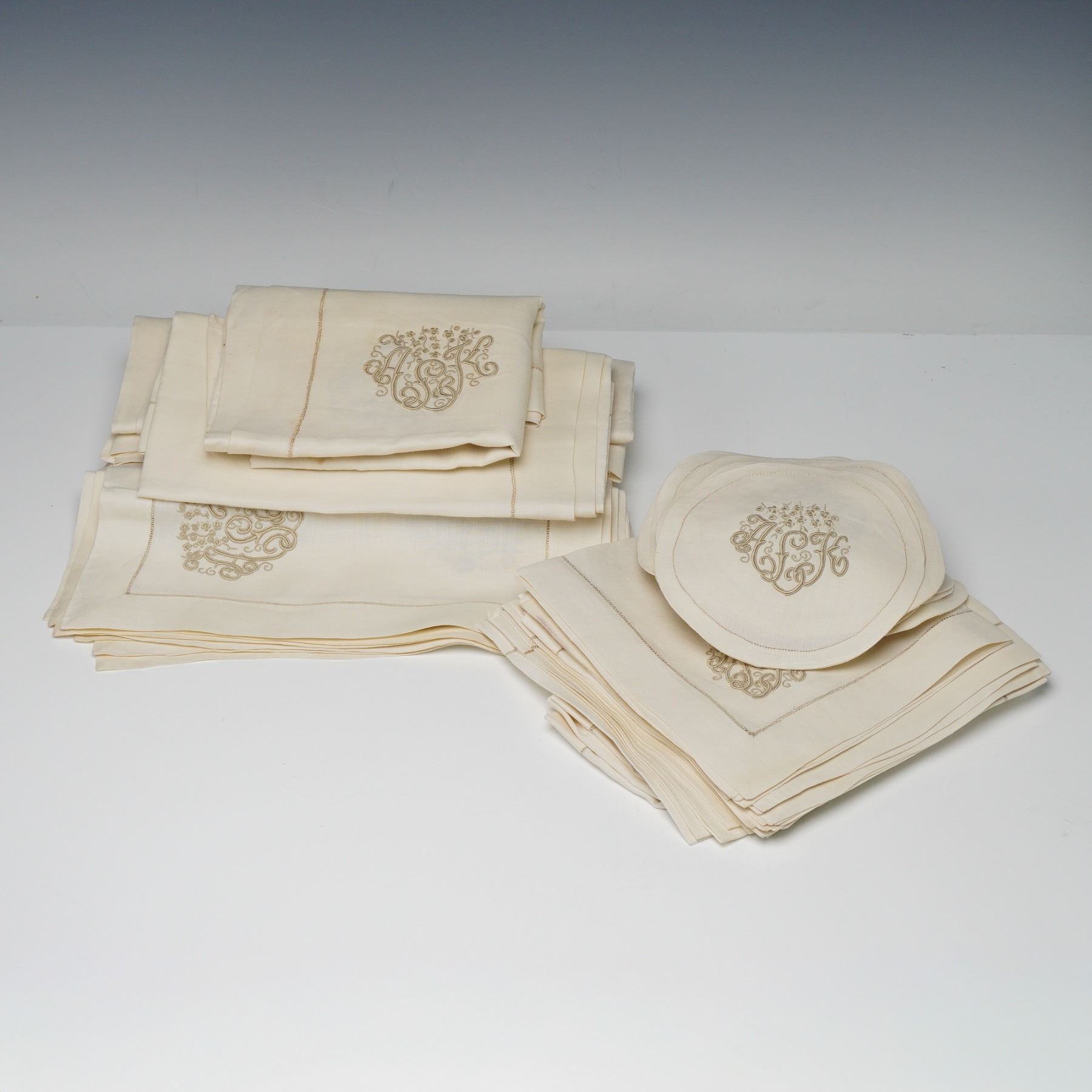 A fine collection of vintage embroidered linen table linens, including runners, placemats, napkins, and round coasters, each featuring an elegant monogrammed design in soft gold thread. The set showcases intricate needlework with scrolling floral embellishments and refined detailing, crafted from high-quality ivory linen. These pieces reflect classic mid-20th-century textile artistry, suitable for both display and functional use in a formal dining setting.