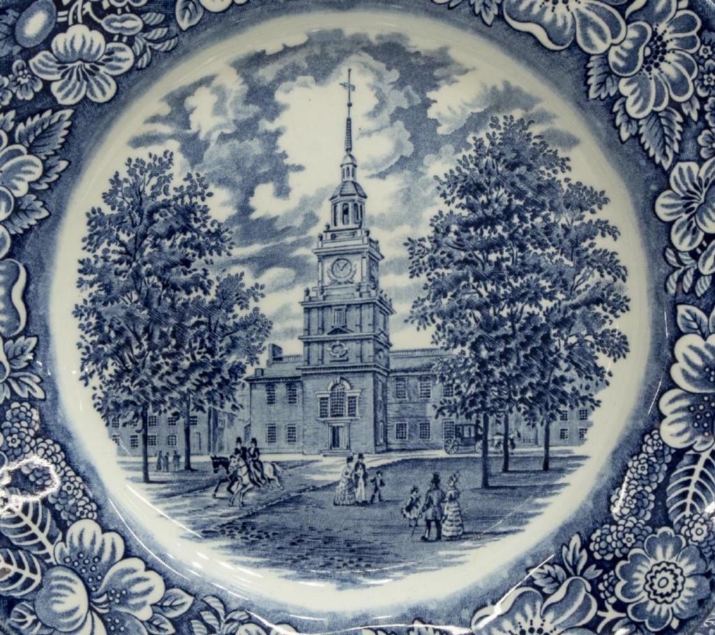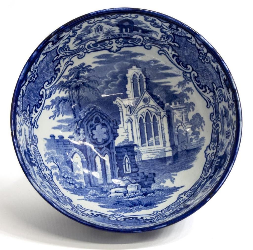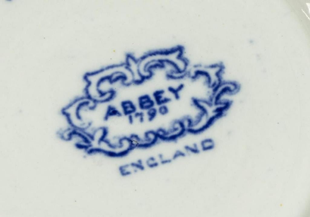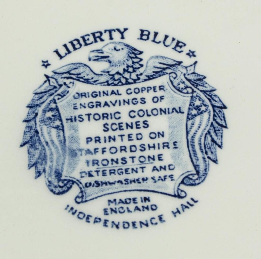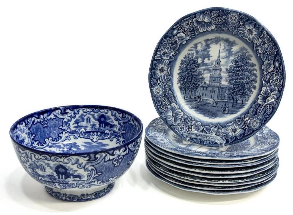English Staffordshire blue & white transferware, including: (1) footed bowl, early 20th c., in the "Abbey" pattern, unmarked, attributed to George Jones & Son, approx 4.5"h, 9"diam, (10) "Liberty Blue" dinner plates, 9.75" D. - 10619-052018-LA-03344