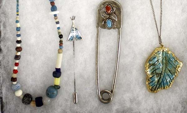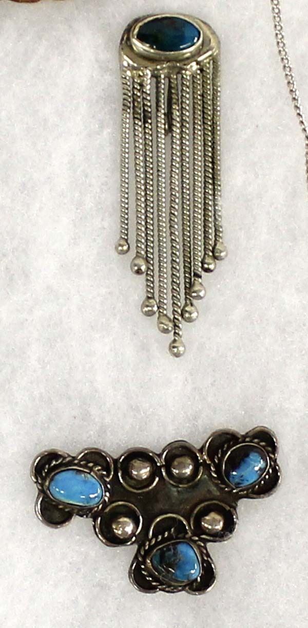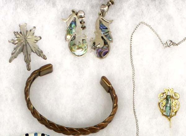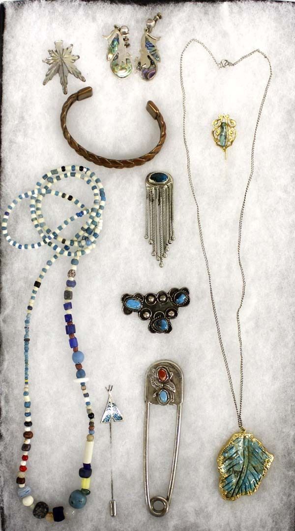 Collection of Estate Jewelry, includes carved turquoise pendant necklace, AJM Co. Turquoise Stick Pin, vintage sterling turquoise pin, antique/vintage sterling turquoise Native American Navajo pin, Navajo Turquoise Coral Key Ring, Silver & Chip Inlay Turquoise Teepee Stick Pin, multi-bead (some trade beads) necklace, large copper bracelet (44.03g), vintage Mexican Taxco Silver and Abalone screwback earrings (hallmarked), and a carved abalone leaf pendant