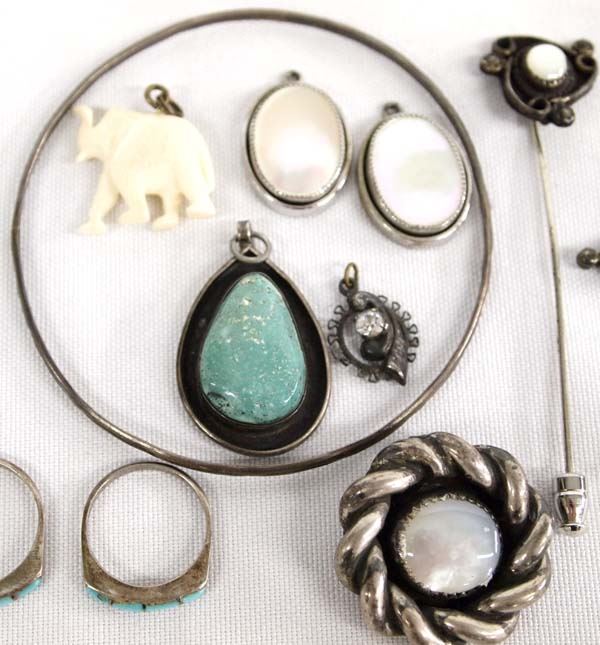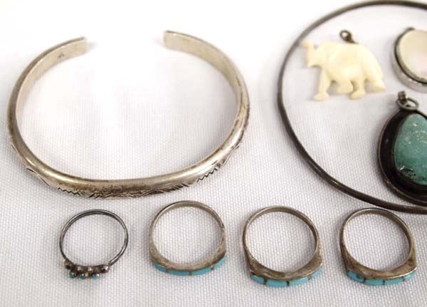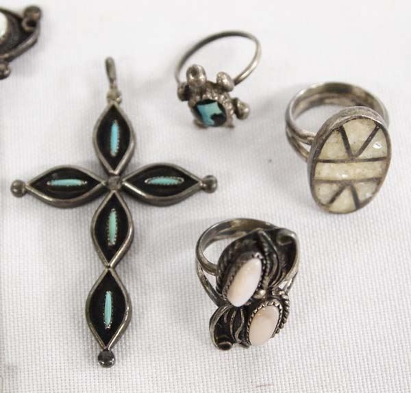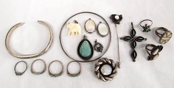 From the Posey Estate we have a Collection of Native American Jewelry, 97.35g in total wt. Includes #1 Navajo Sterling Mother of Pearl Ring size 4, #2 Navajo Sterling Mother of Pearl Pendant (heavy 19.38g), #3 Mother of Pearl Earrings, #4 Navajo Sterling Turquoise Jet Turtle Ring, #5 Navajo Channel Inlay Mother of Pearl Ring, #6 Three Zuni Sterling Channel Inlay Turquoise Rings, #7 Vintage CZ Pendant, #8 Navajo Sterling Turquoise Pendant, #8 Zuni Sterling Turquoise Coral Reversible Cross Pendant, #9 Zuni Sterling Petit Point Turquoise Ring, #10 Navajo Sterling Mother of Pearl Stick Pin, #11 Carved Bone Elephant Pendant, #12 Apache Stamped Sterling Guard Bracelet by Vergie Edwards (25.8g) #13 Navajo Stamped Sterling Bangle Bracelet