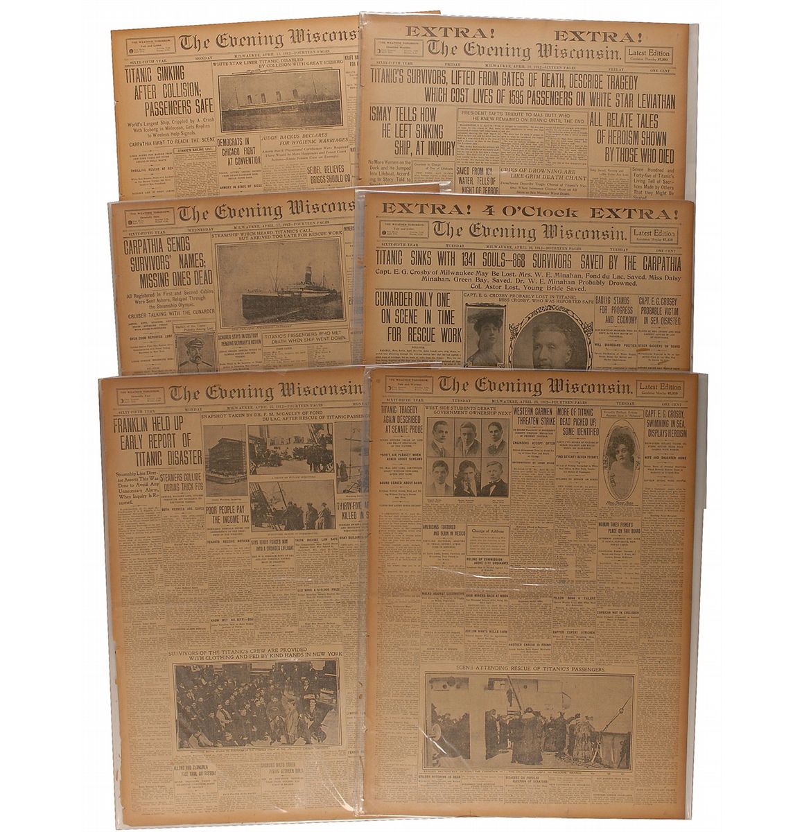 Collection of 14 issues of The Evening Wisconsin, no Sunday editions, all approximately dating from April 15–20, 22–27, and 29 and 30, 1912, with the headlines chronicling the latest developments of the Titanic. April 15 headline states “Titanic Sinking After Collision; Passengers Safe.” The following day the realization of the tragedy is reported in the headline “Titanic Sinks With 1341 Souls—868 Survivors Saved By Carpathia.” Issue also features an image of prominent Milwaukee passenger Captain E. G. Crosby. The April 18 issue has an image of the Titanic at sea, a map showing the area of the accident, and images of prominent passengers including the Astors, Archibald Butt, Isidor Straus, and Frank Millet. Headlines in later issues deal with the inquiry and other issues surrounding the accident, including one which states “Titanic Investigation is ‘Brutally Unfair,’ says J. Bruce Ismay.” In very good condition, with expected toning, fragile pages, edge tears, and binding holes to left edge. A great collection chronicling the first two weeks after the tragedy, which included several prominent Wisconsin residents.