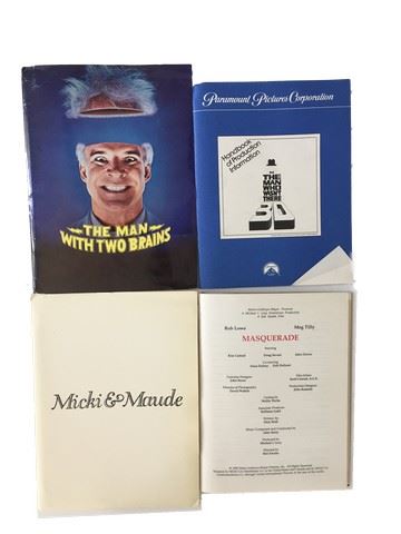 Collection of 4 press kits with a large collection of black and white publicity stills included, sized mainly 8x10's. (1970's-90's). From Warner Brothers "The Man With Two Brains" (1983), from Columbia Pictures "Micki & Maude" (1984), from Paramount Pictures " The Man Who Wasn't There" (1983), from MGM "Masquerade" (1988), collection of ~50 black and white stills from "Mixed Company 1974, "The Missouri Breaks" (1976).