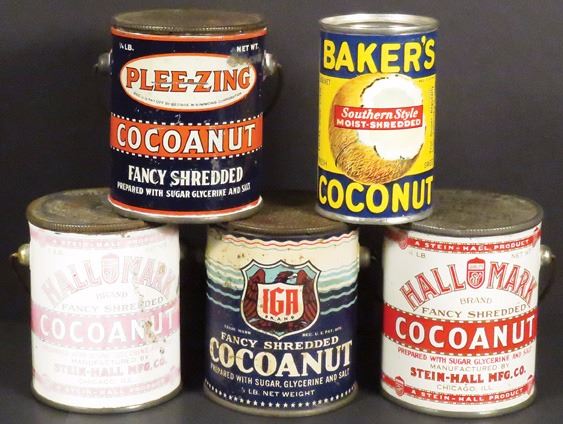 Collection of Five Coconut Tins. Plee-zing, Hall mark and IGA brands 1/4 lb tins with bales. Baker's 1/8 lb tin with paper label. One Hallmark tin has a large scratch and paint loss, otherwise fair to good overall condition.
