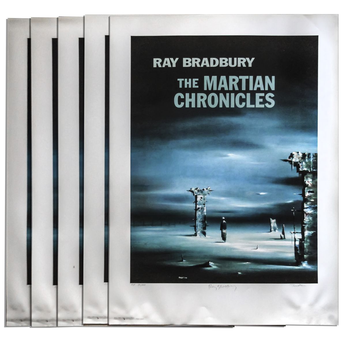 Lot of 5 ''The Martian Chronicles'' artist proofs signed by both Ray Bradbury and Robert Watson. Watson created the stunning cover art for the second 1953 edition of Bradbury's famous tome. Poster is headed ''Ray Bradbury / The Martian Chronicles'' and portrays a solitary human being, surrounded by decaying structural columns. Signed ''Ray Bradbury'' in pencil to center and ''R. Watson'' in pencil to right side. Each poster is numbered, ''A/P 22/200'', ''A/P 23/200'', ''A/P 24/200'', ''A/P 32/200'' and ''A/P 33/200''. Posters measure 22'' x 30''. Each has some dampstaining along bottom. Very good condition. With a COA from the Ray Bradbury estate.