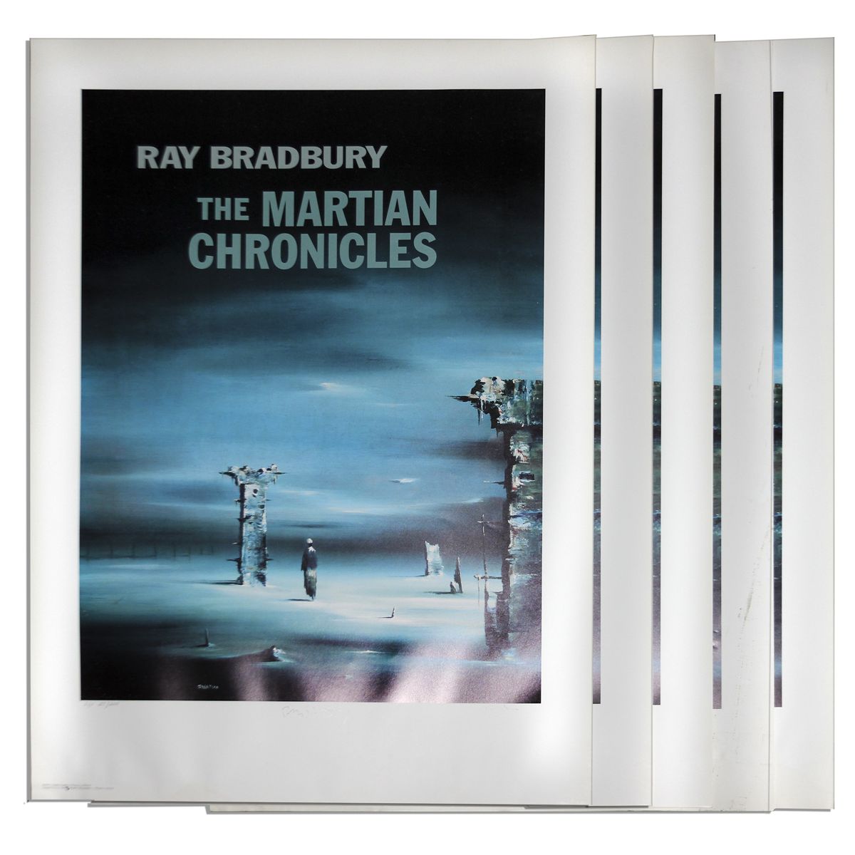 Lot of 5 ''The Martian Chronicles'' artist proofs signed by both Ray Bradbury and Robert Watson. Watson created the stunning cover art for the second 1953 edition of Bradbury's famous tome. Poster is headed ''Ray Bradbury / The Martian Chronicles'' and portrays a solitary human being, surrounded by decaying structural columns. Signed ''Ray Bradbury'' in pencil to center and ''R. Watson'' in pencil to right side. Each poster is numbered, ''A/P 21/200'', ''A/P 25/200'', ''A/P 26/200'', ''A/P 27/200'', and ''A/P 31/200''. Posters measure 22'' x 30''. Very good to near fine. With a COA from the Ray Bradbury estate.