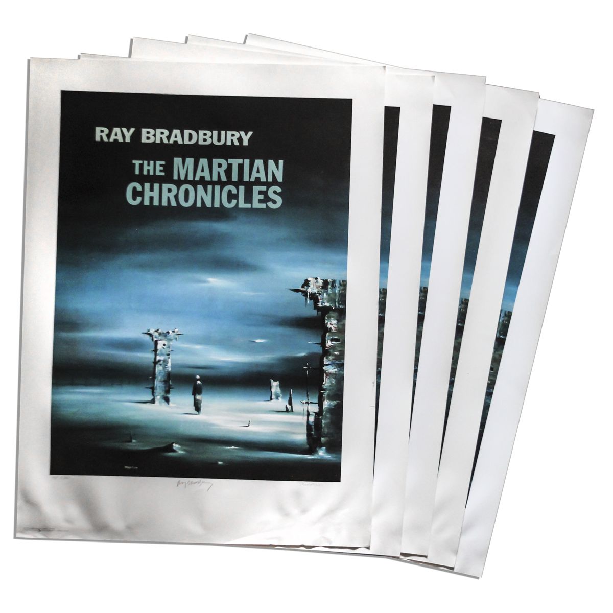Lot of 5 ''The Martian Chronicles'' artist proofs signed by both Ray Bradbury and Robert Watson. Watson created the stunning cover art for the second 1953 edition of Bradbury's famous tome. Poster is headed ''Ray Bradbury / The Martian Chronicles'' and portrays a solitary human being, surrounded by decaying structural columns. Signed ''Ray Bradbury'' in pencil to center and ''R. Watson'' in pencil to right side. Each poster is numbered, ''A/P 14/200'', ''A/P 15/200'', ''A/P 17/200'', ''A/P 29/200'', and the fifth duplicated again ''A/P 17/200'' as a mistake. Posters measure 22'' x 30''. Each has some dampstaining along bottom and two posters have tiny tears to edges, overall very good condition. From the Ray Bradbury estate.