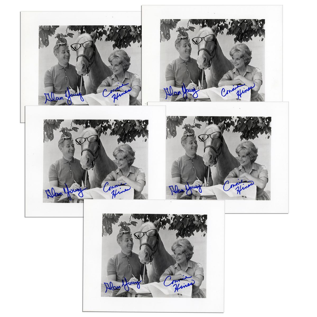 Collection of five ''Mister Ed'' Alan Young and Connie Hines signed black and white glossy photos. Photos depict each actor smiling posing beside the famed star of the show, Mister Ed, the talking horse who wears glasses. Signed in blue marker beneath their photos, ''Alan Young'' and ''Connie Hines''. Photos measure 10'' x 8'' and are in fine condition.