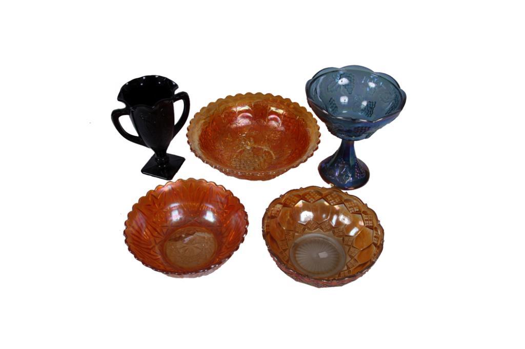 Collection of Five Pieces of Carnival Glass Three bowls, one blue pedestal dish that has a chip to the rim, and one dark blue double handled vase.Three bowls, one blue pedestal dish that has a chip to the rim, and one dark blue double handled vase.