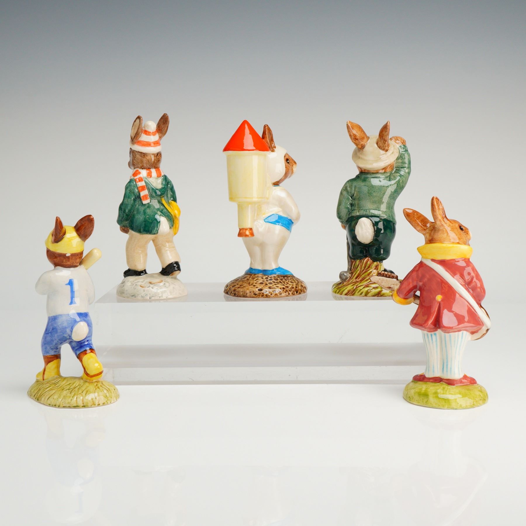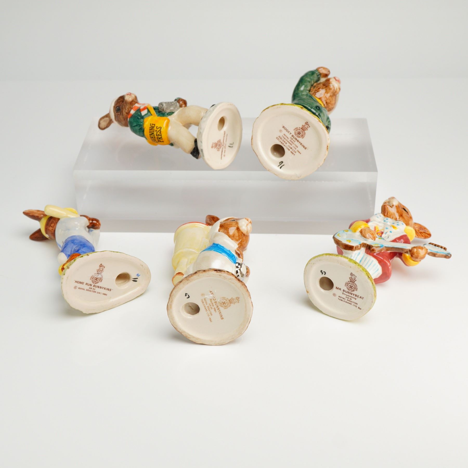 A Collection of 5 ceramic Royal Doulton Bunnykins figurines, including Bogey DB 32, Mr. Bunnybeat Strumming DB16, Paperboy DB77, Homerun DB43, and Astro Rocketman DB20, marked MADE IN ENG. LTD. 1984.