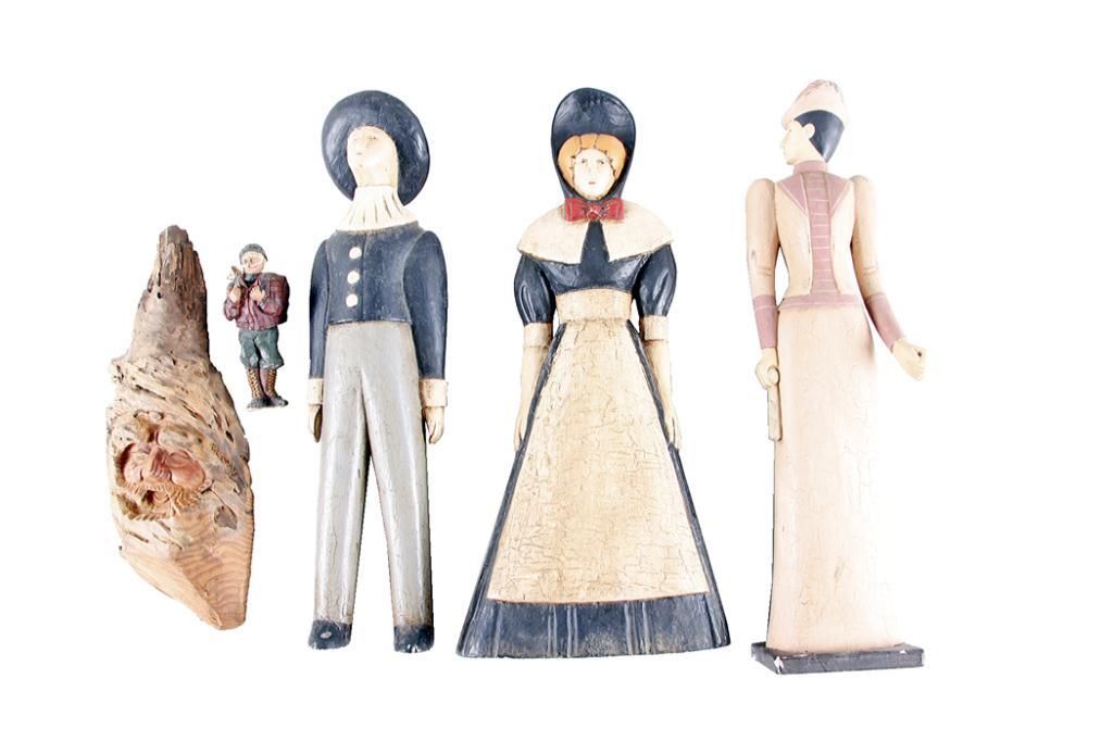 Collection of Five Wood Carvings Three are Americana folk art style, and two smaller American carvings of mountain men.Three are Americana folk art style, and two smaller American carvings of mountain men.