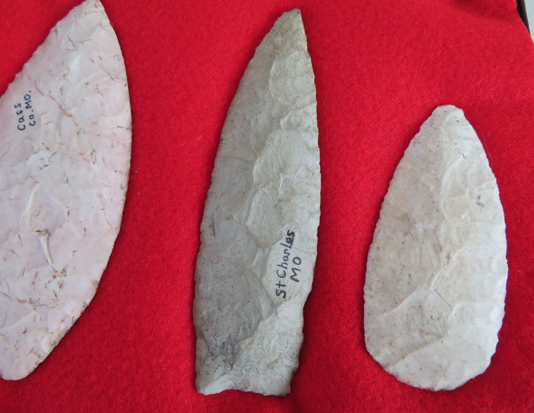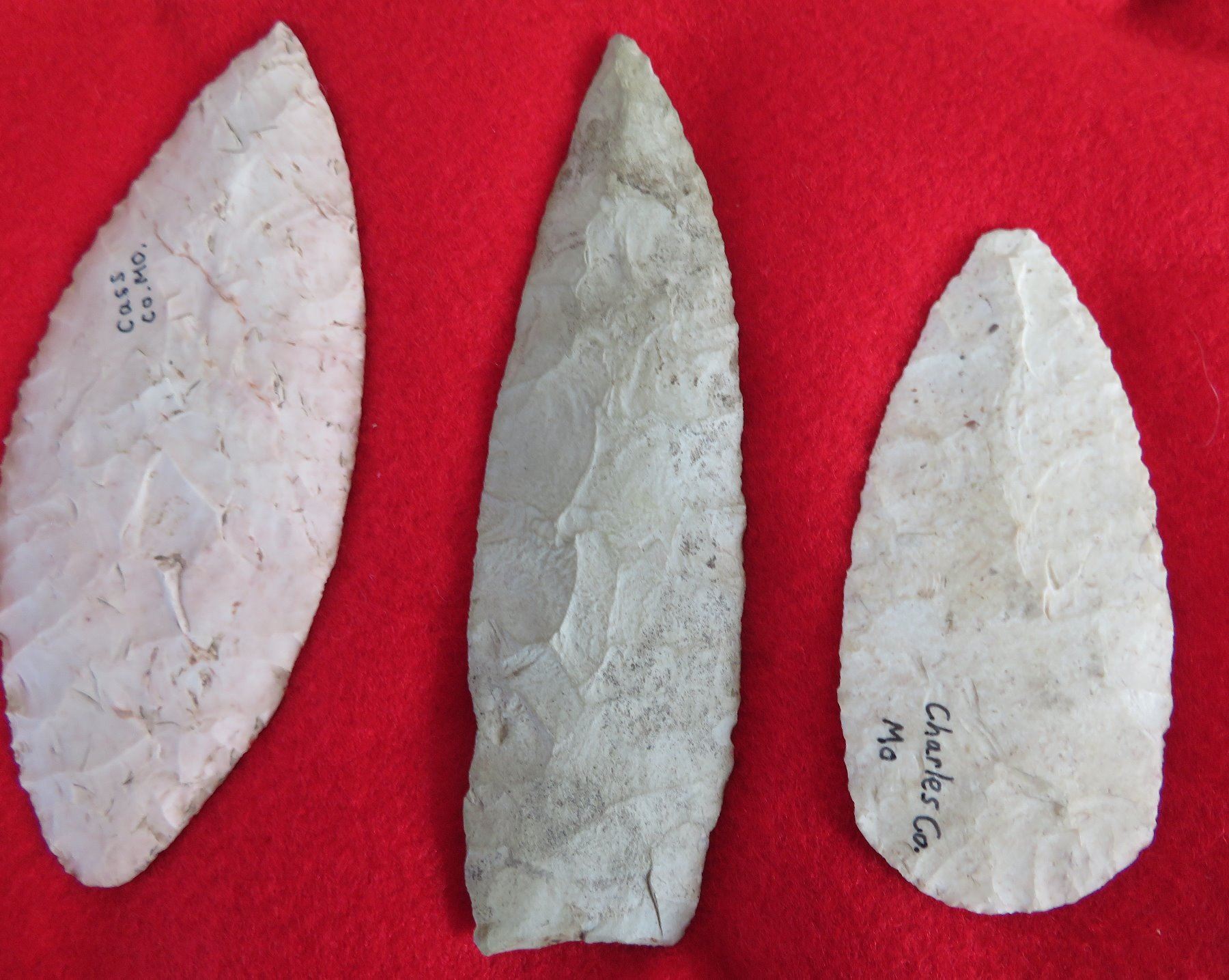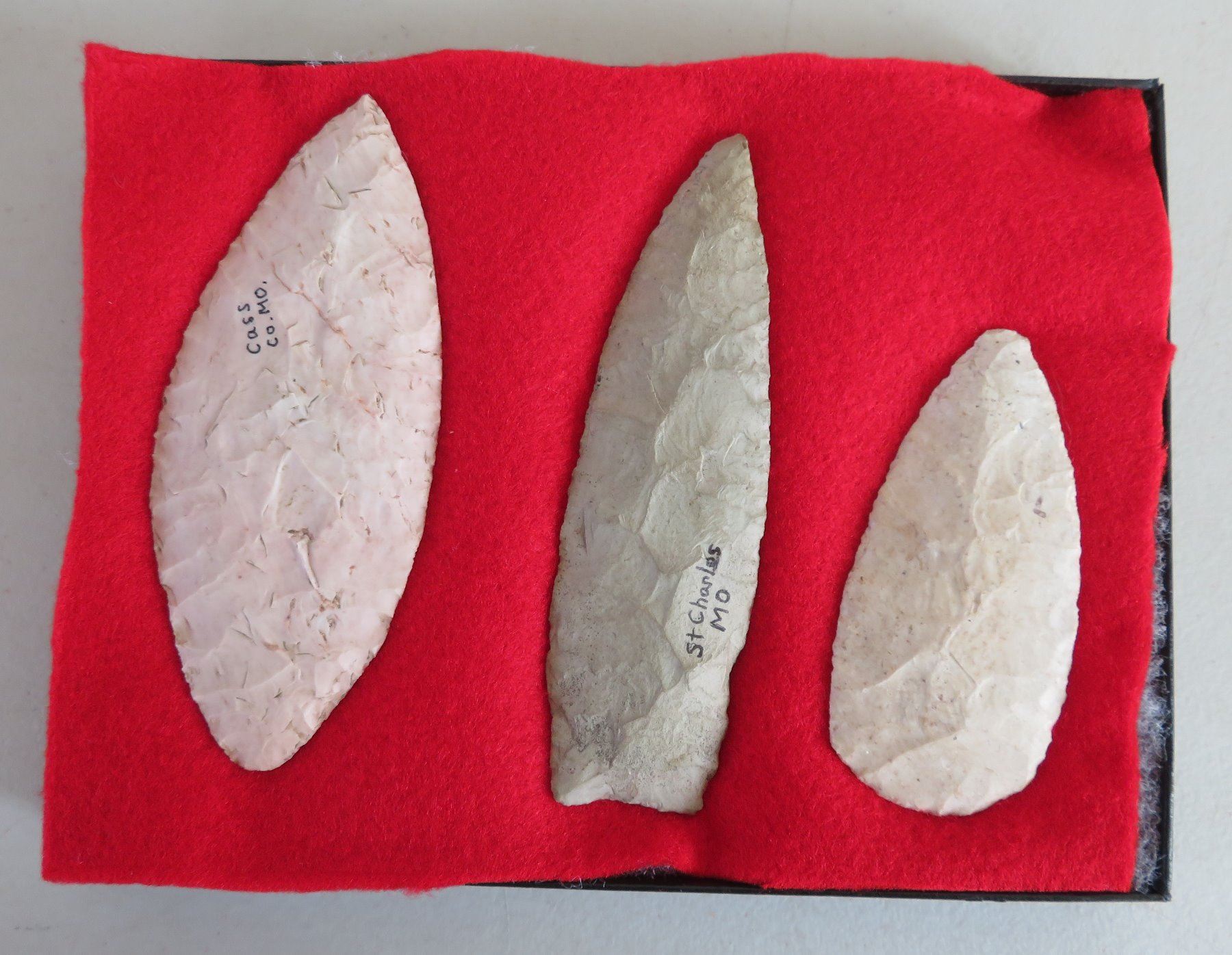 Collection of Flint Artifacts, pre-historic items. Made of chert, the longest item measures 5 1/4". Missouri. Frame not included. Nice blades. Condition: As found, good, see images. Shipping: $25.50 w/insurance and signature, due to value.