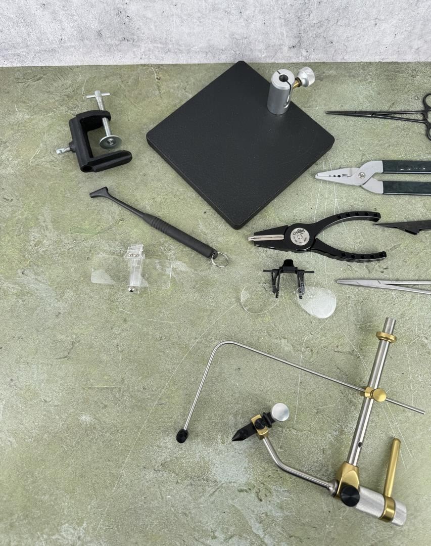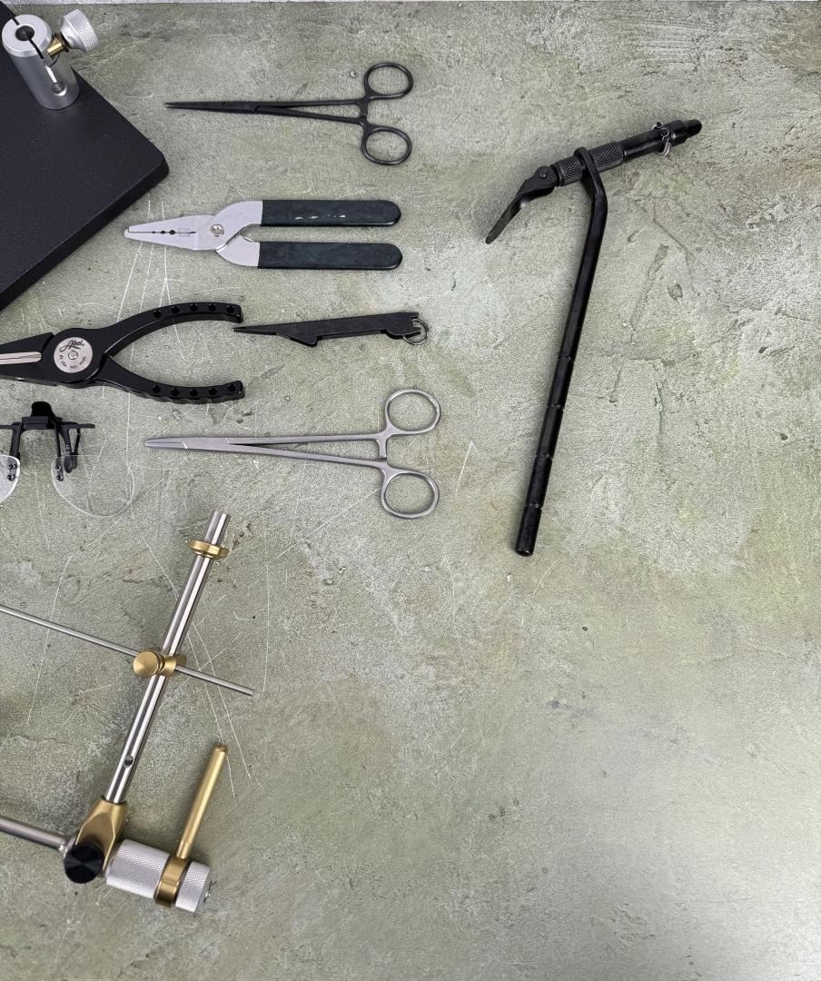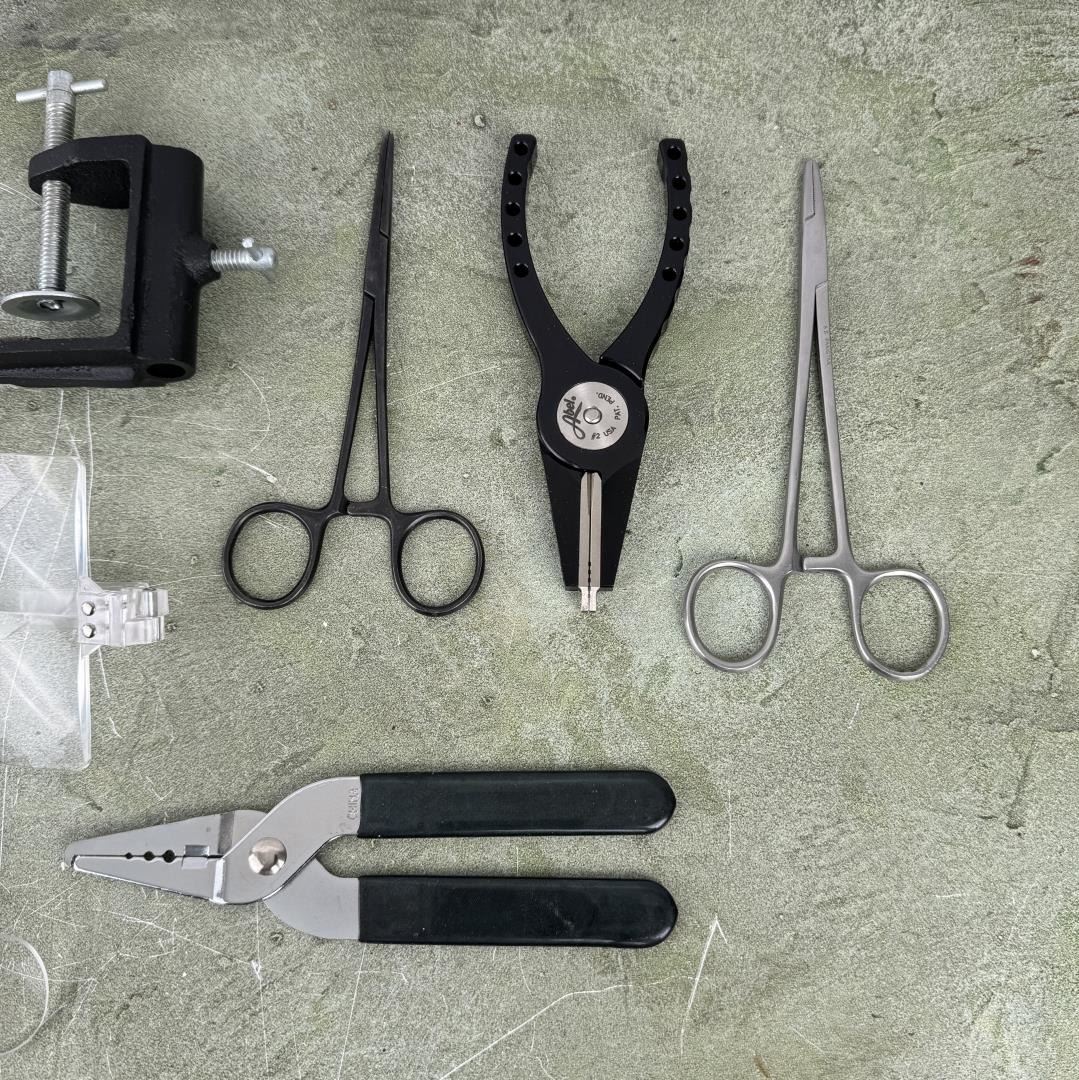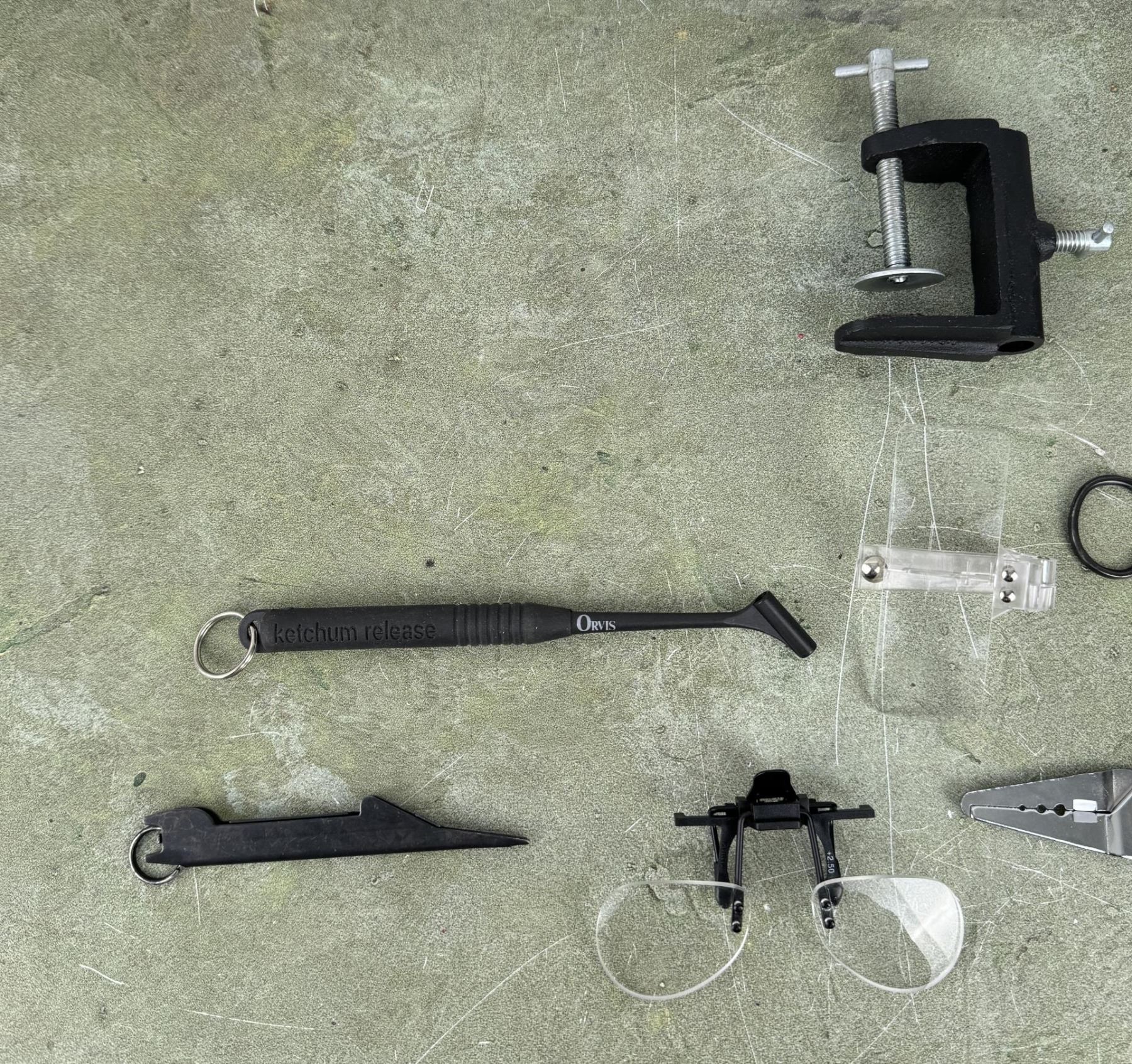 Notable items include a set of Abel #2 Pliers, Orvis Ketchum Release, Sunrise Super Vise.