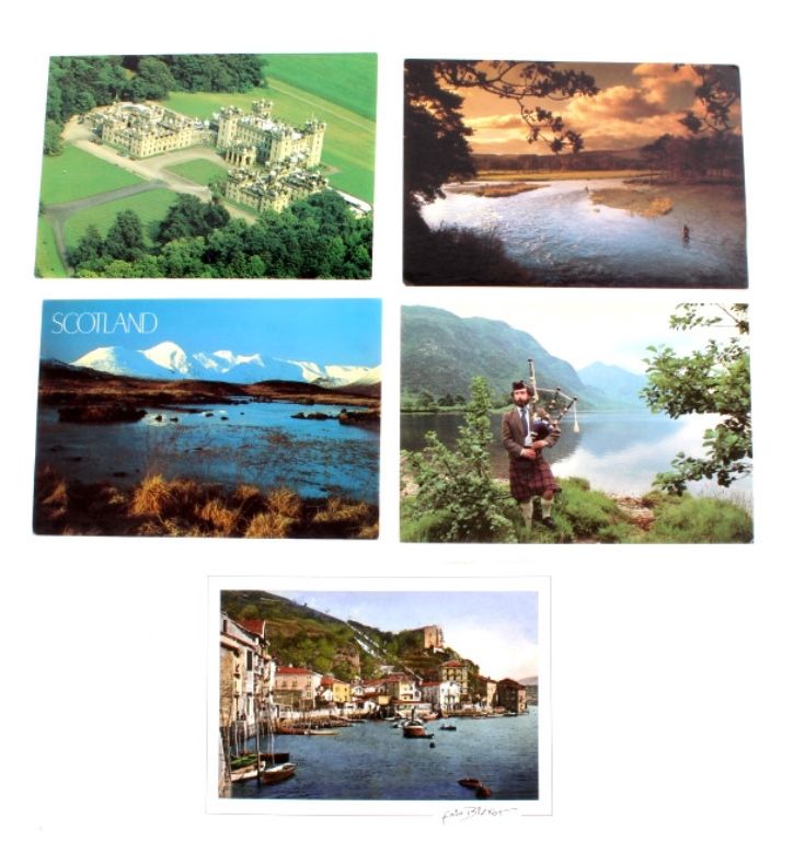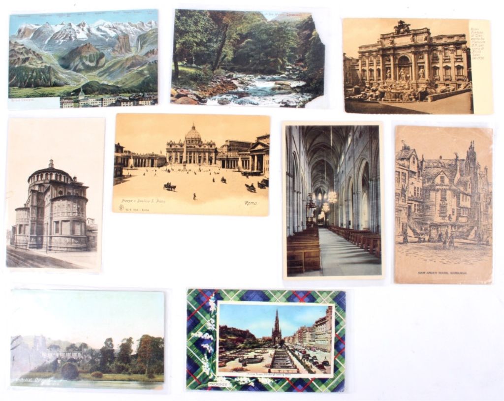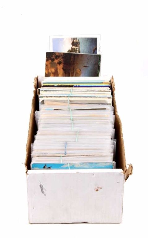 This is a collection of foreign post cards ranging all around Europe including Spain, Italy, Scotland, France, and Greece. The collection around 819 cards and 9 folders. These cards are in mint condition and readysend off. Most of these post cards are in plastic sleeves. Measures 15"x7"x5".